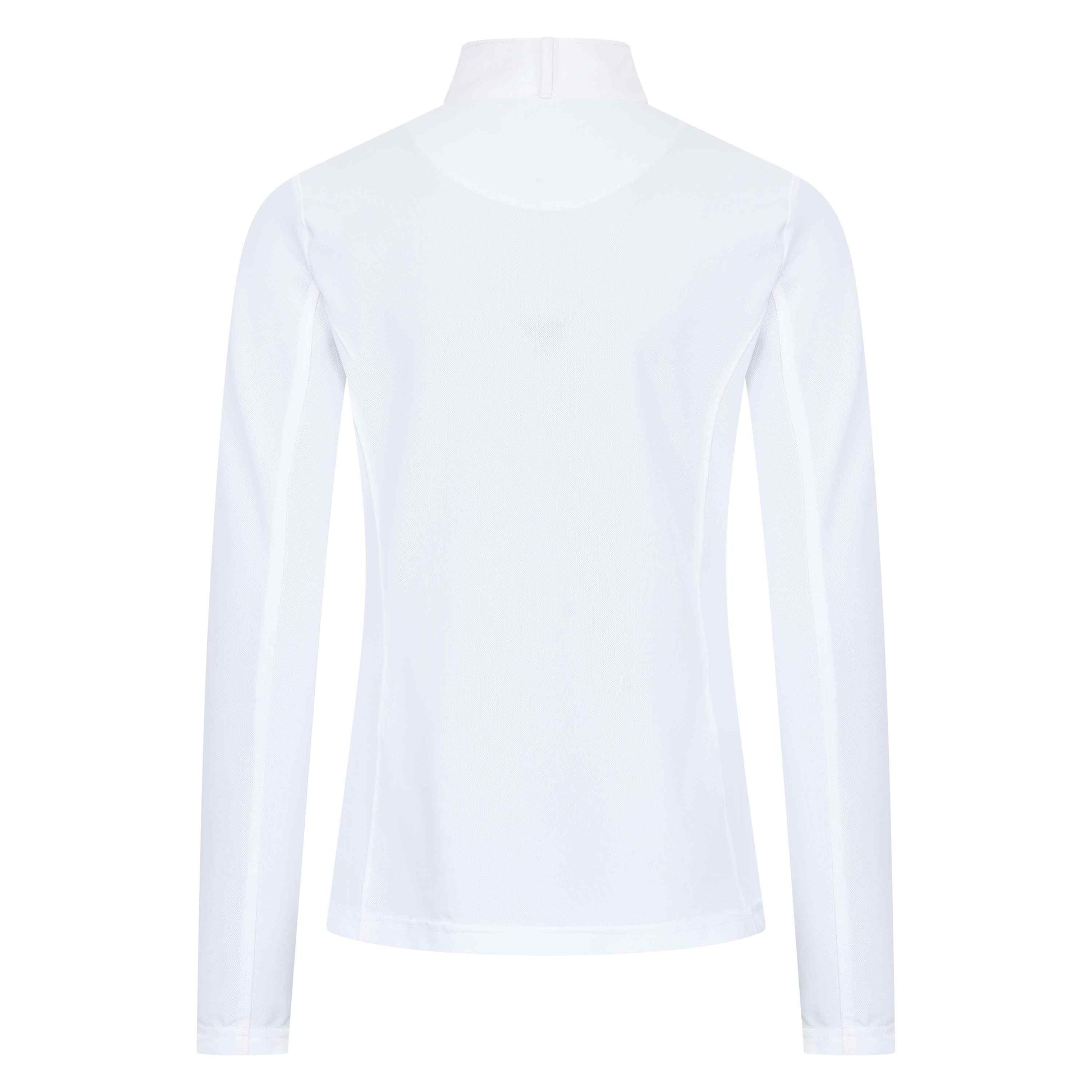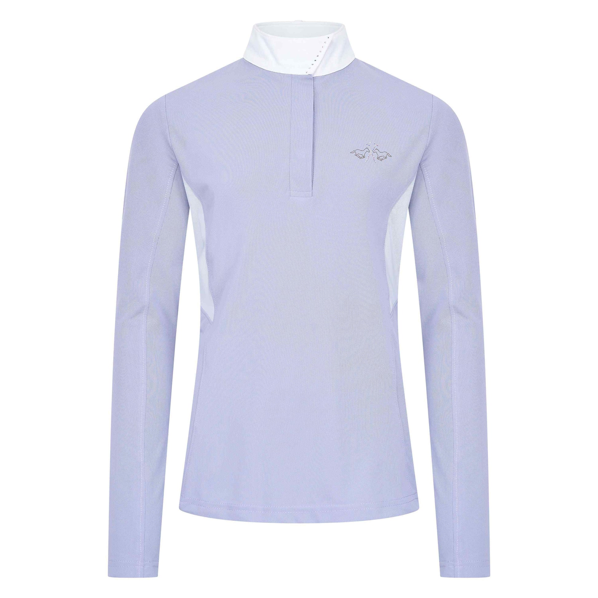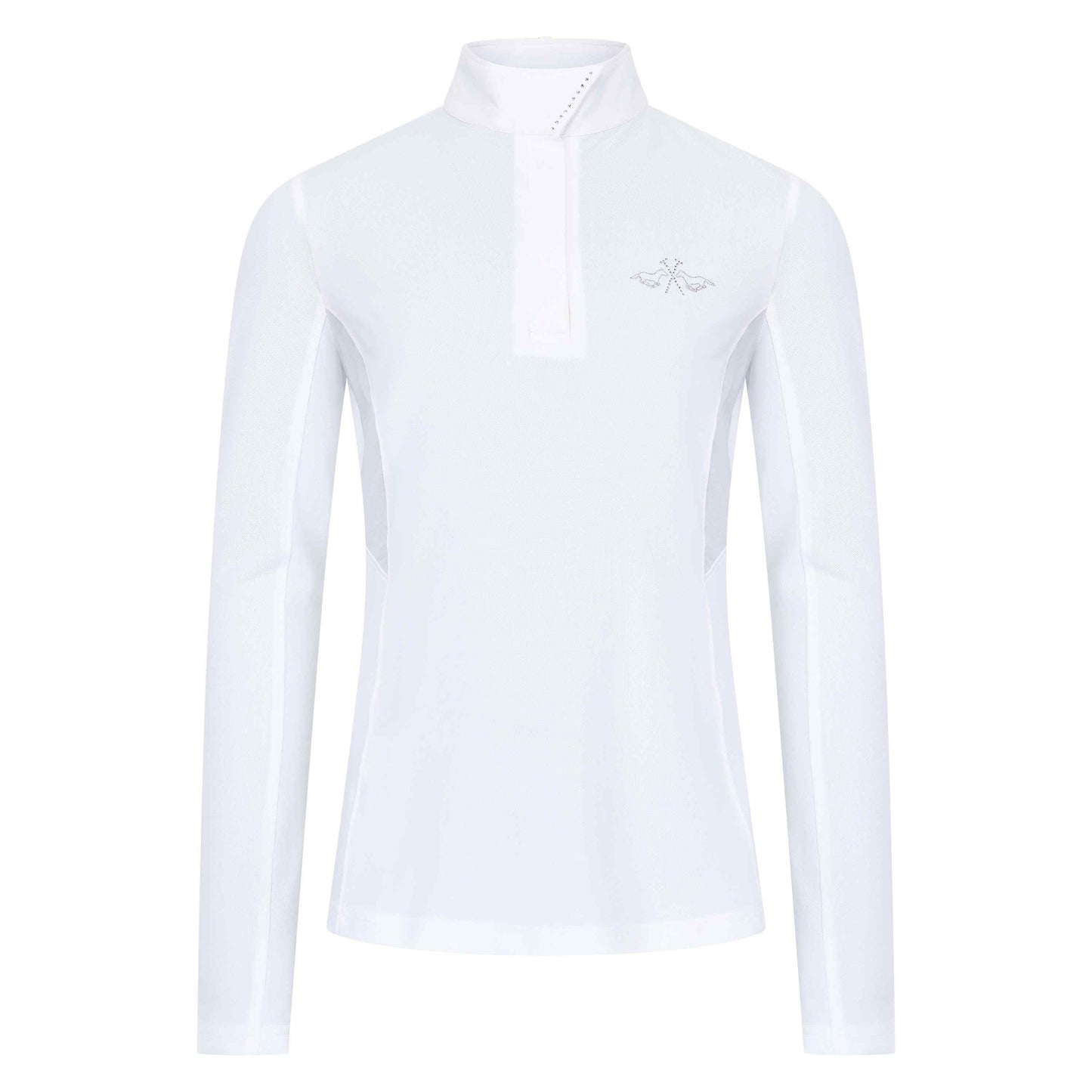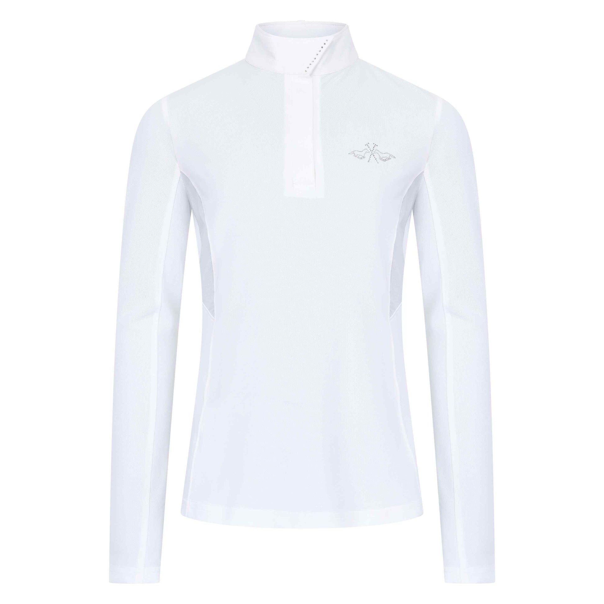 Mesh competition top with half placket * Enclosure is blind zippers * Collarstand with rhinestones at the edge * Logo on breast with stones and print