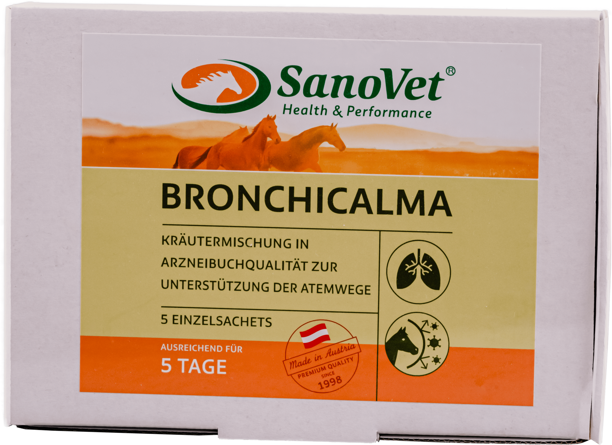 Suplimentul alimentar fin măcinat „BRONCHICALMA” de la SanoVet este un amestec pur natural de ierburi și nu conține agenți dopanți. Are proprietăți bune de biodisponibilitate și vine într-un pachet convenabil de 5 plicuri. Este o alternativă încercată și testată care poate fi folosită înainte de o competiție și poate susține funcția pulmonară. BRONCHICALMA este eficient fiziologic!