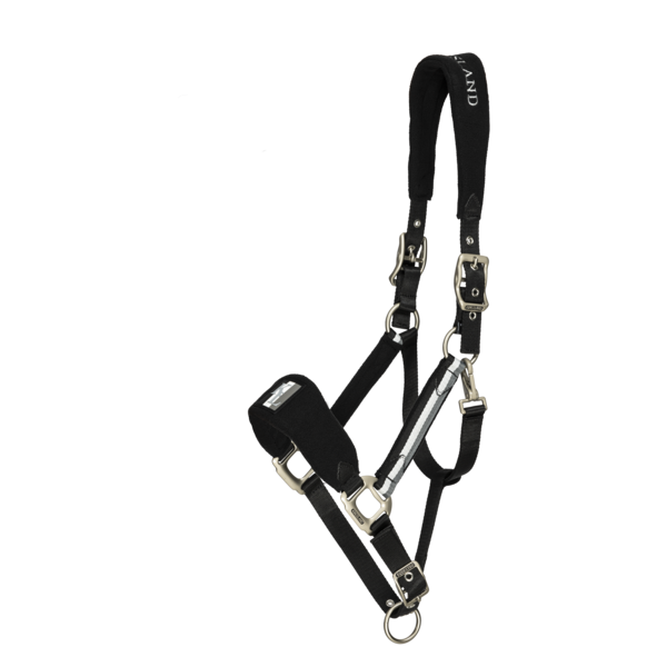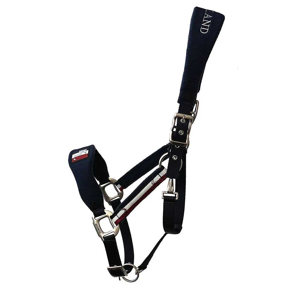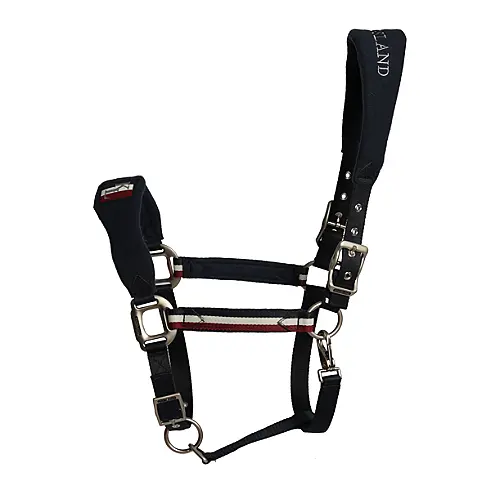Nylon halter with fleece padded nose and neck band. Three coloured band on both sides. Silicone corporate logo patch on nose band. Kingsland embroidery on neck band.