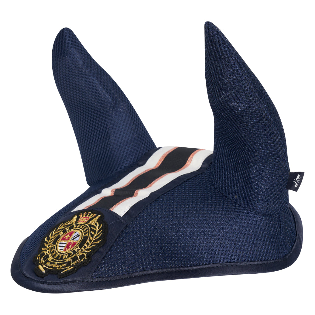 Flyveil made out of mesh material with a binding made out off shiny satin polyester material a sporty stripe application and a badge on top.