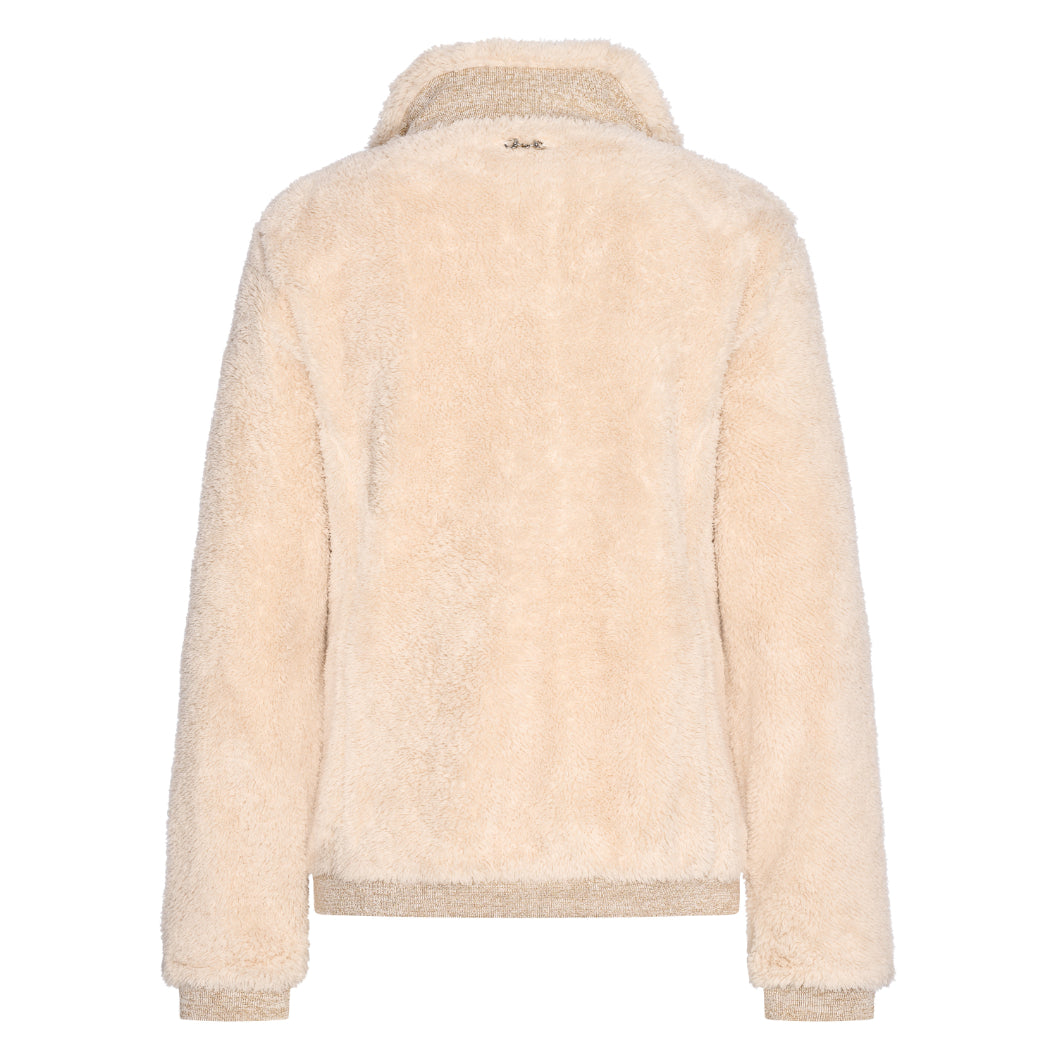 2-way zipper closure at front * Pockets with zipper closure * Metal bit at back neck * Rib cuff and bottom hem with lurex tipping * Badge at sleeve * Velvet tape with lurex along zip and neckline inside * Piping along front and pocket zippers