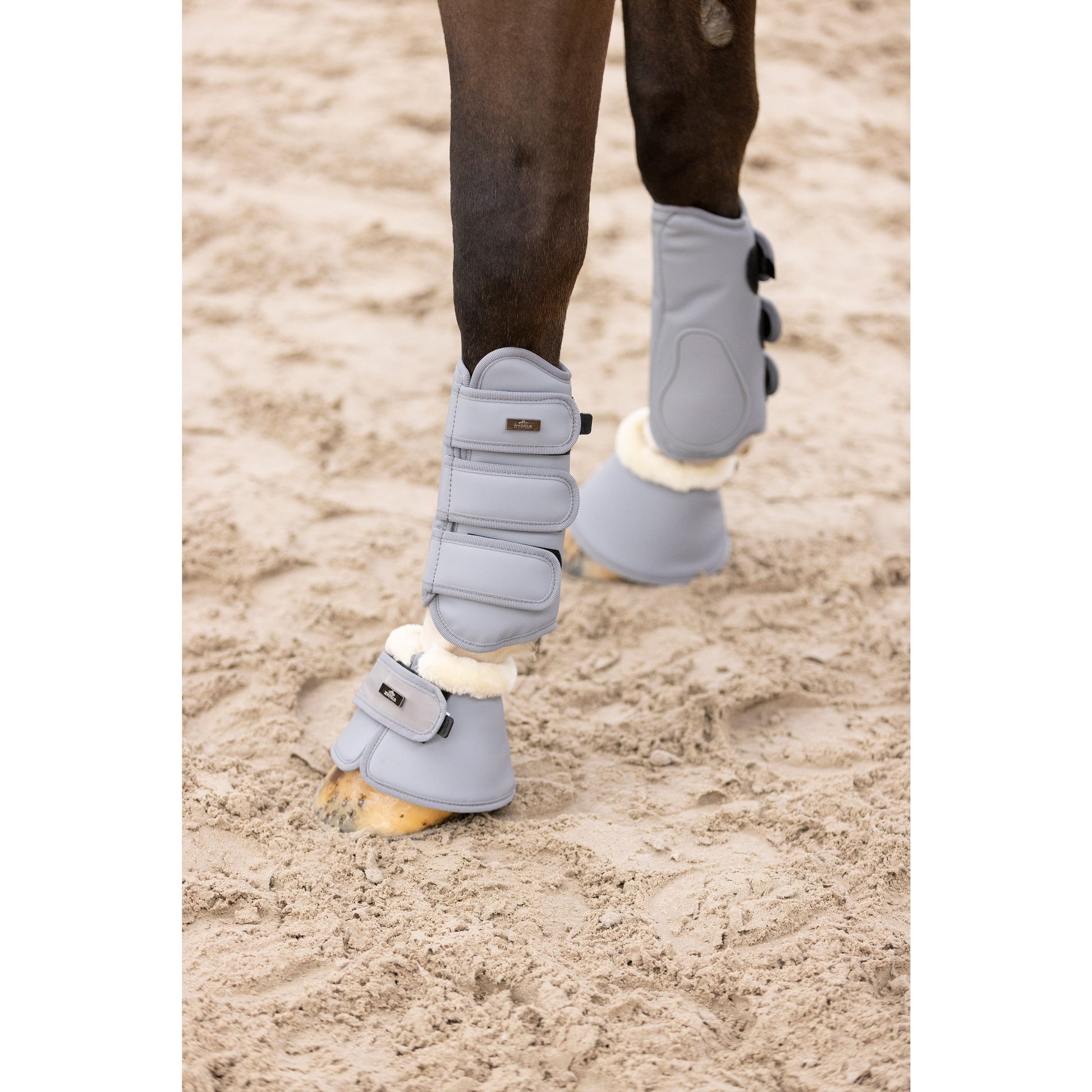 Bellboots made out of PU material with a strap of fake memory material. The bellboots has a faux fur lining. With small metal plate and rubber label at closure strap.
