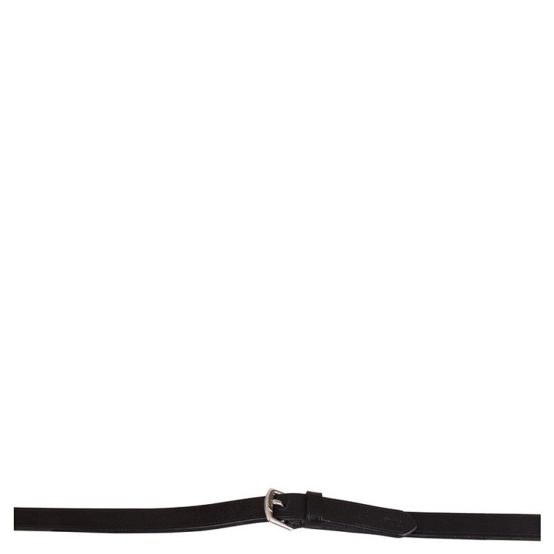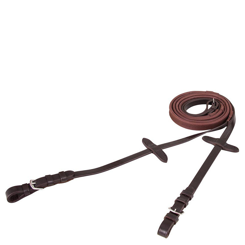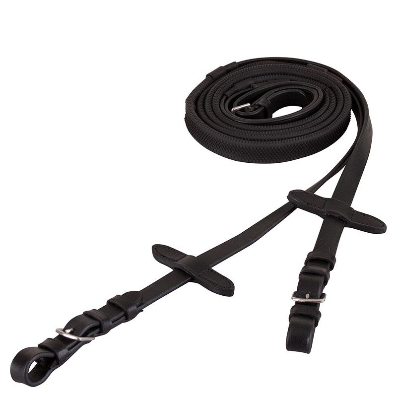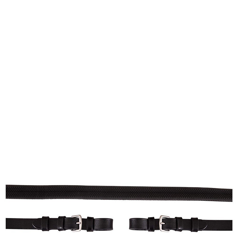 Rubber grip rein (16 mm wide) with leather rein stops and strengthened with nylon. The leather ends, with stainless steel buckle closure, are also 16 mm wide.
