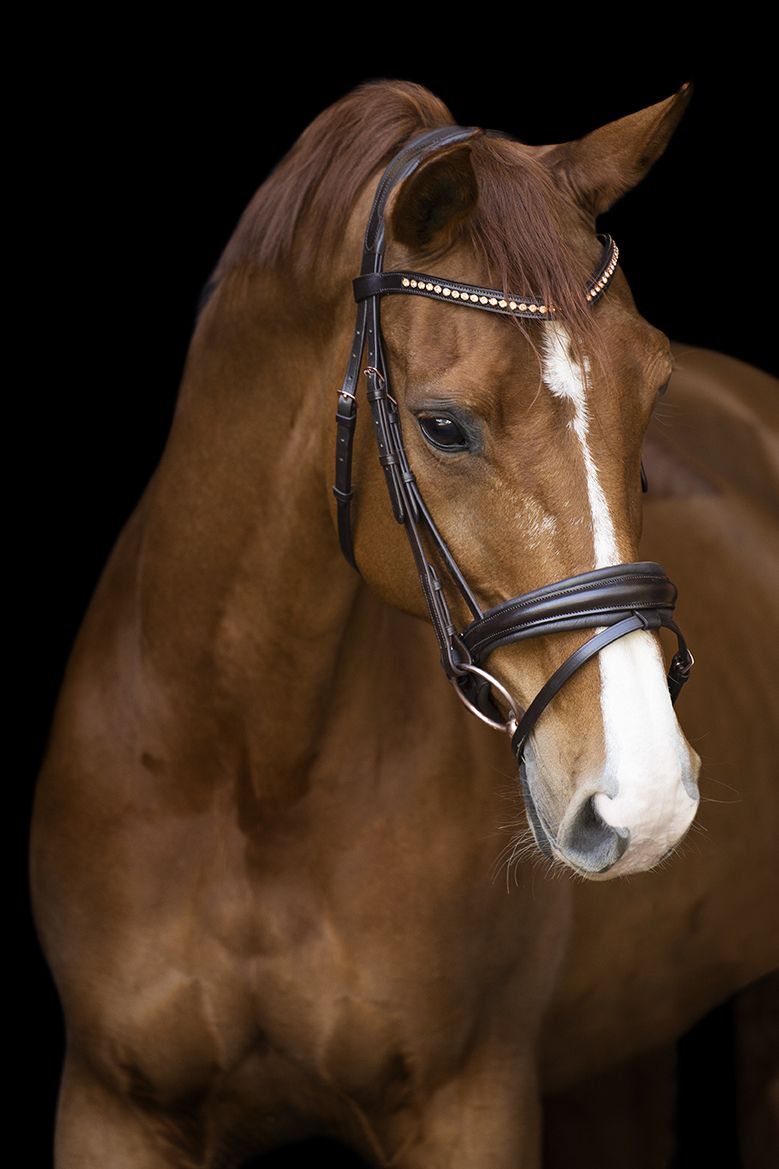 Anatomical shaped snaffle bridle IRHFria. The headpiece and the noseband are anatomical shaped with a soft sheep leather padding. The browband has rhinestones which are inlaid in leather. Bridle is supplied without reins