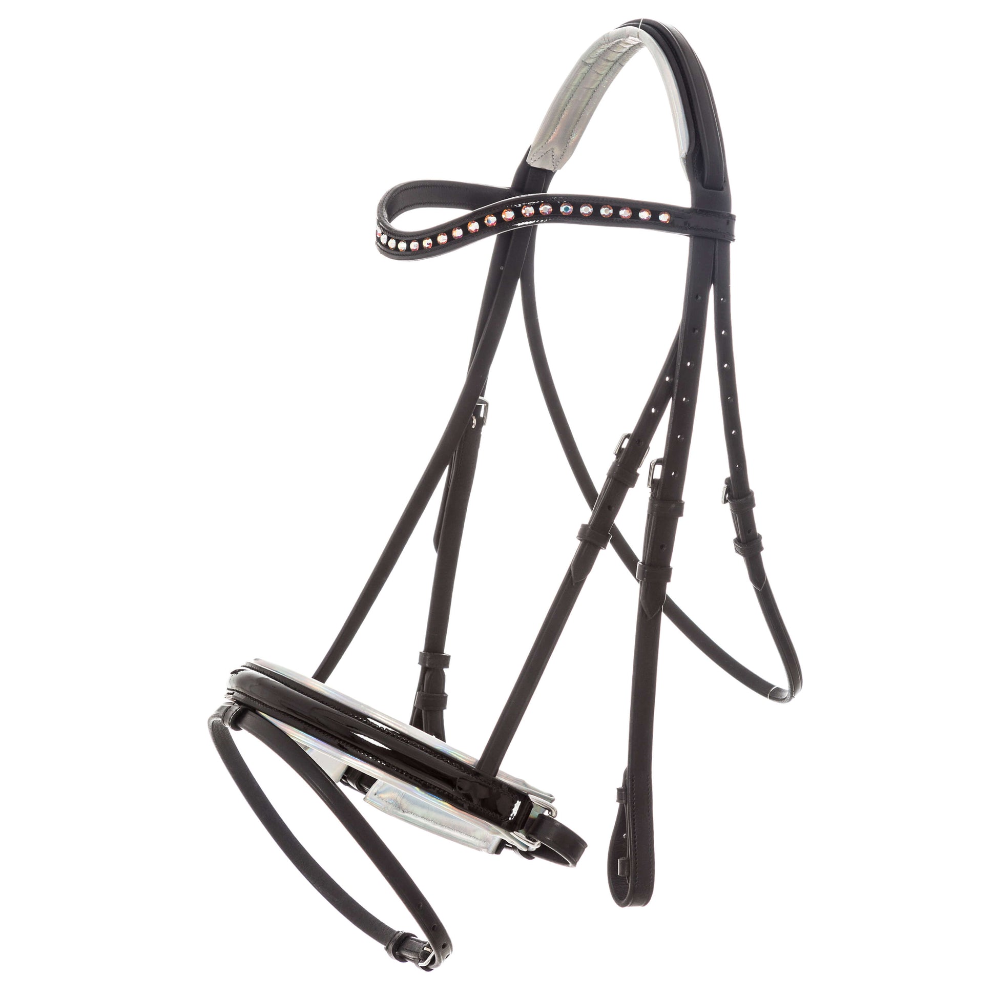 | Snaffle bridle Di Layla with flash crack noseband. Of fine quality leather and luxurious appearance due to the use of patent leather accents and wave browband with rhinestones. With padded noseband and crownpiece. With hook closures. With web rein |