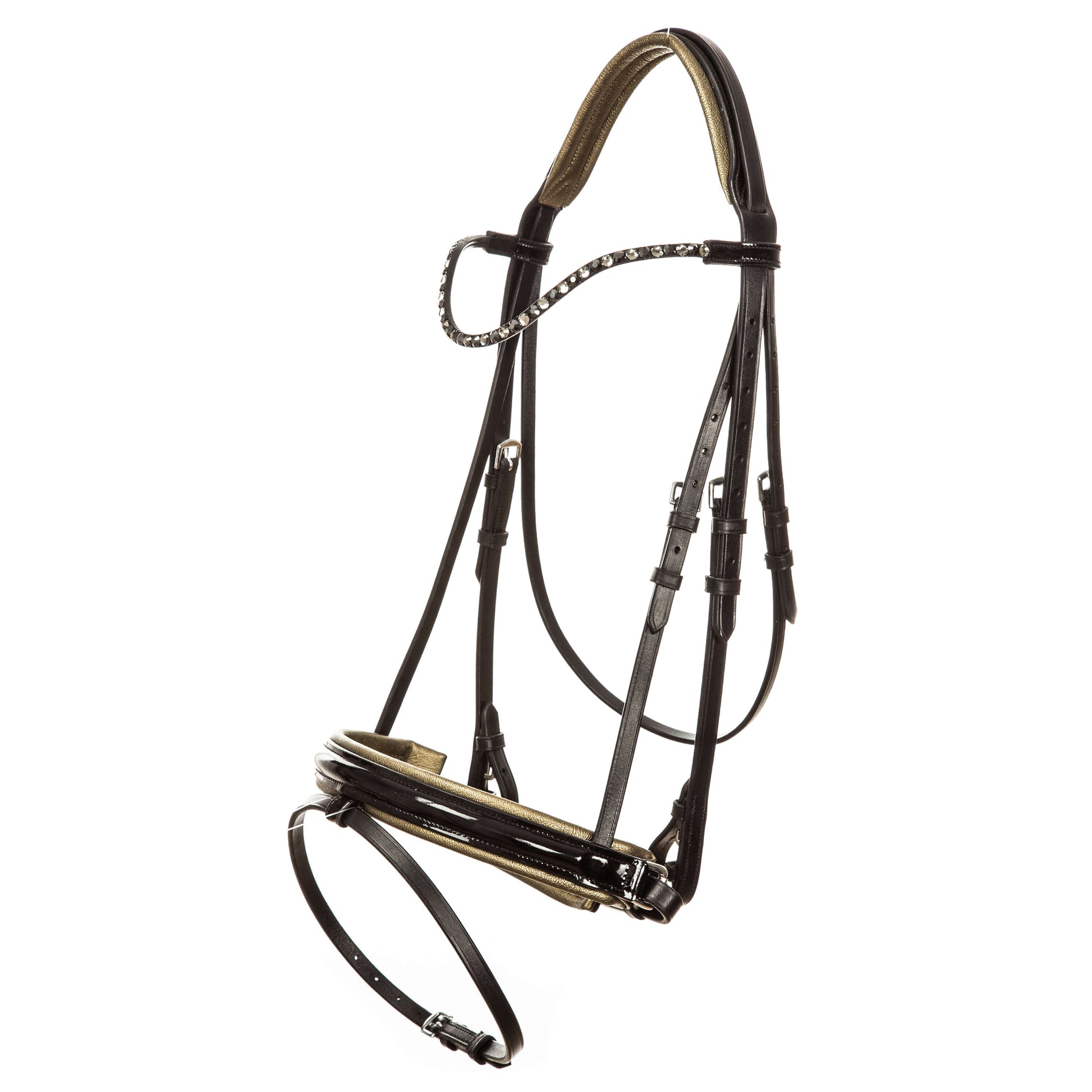 | Snaffle bridle Di Layla with flash crack noseband. Of fine quality leather and luxurious appearance due to the use of patent leather accents and wave browband with rhinestones. With padded noseband and crownpiece. With hook closures. With web rein |