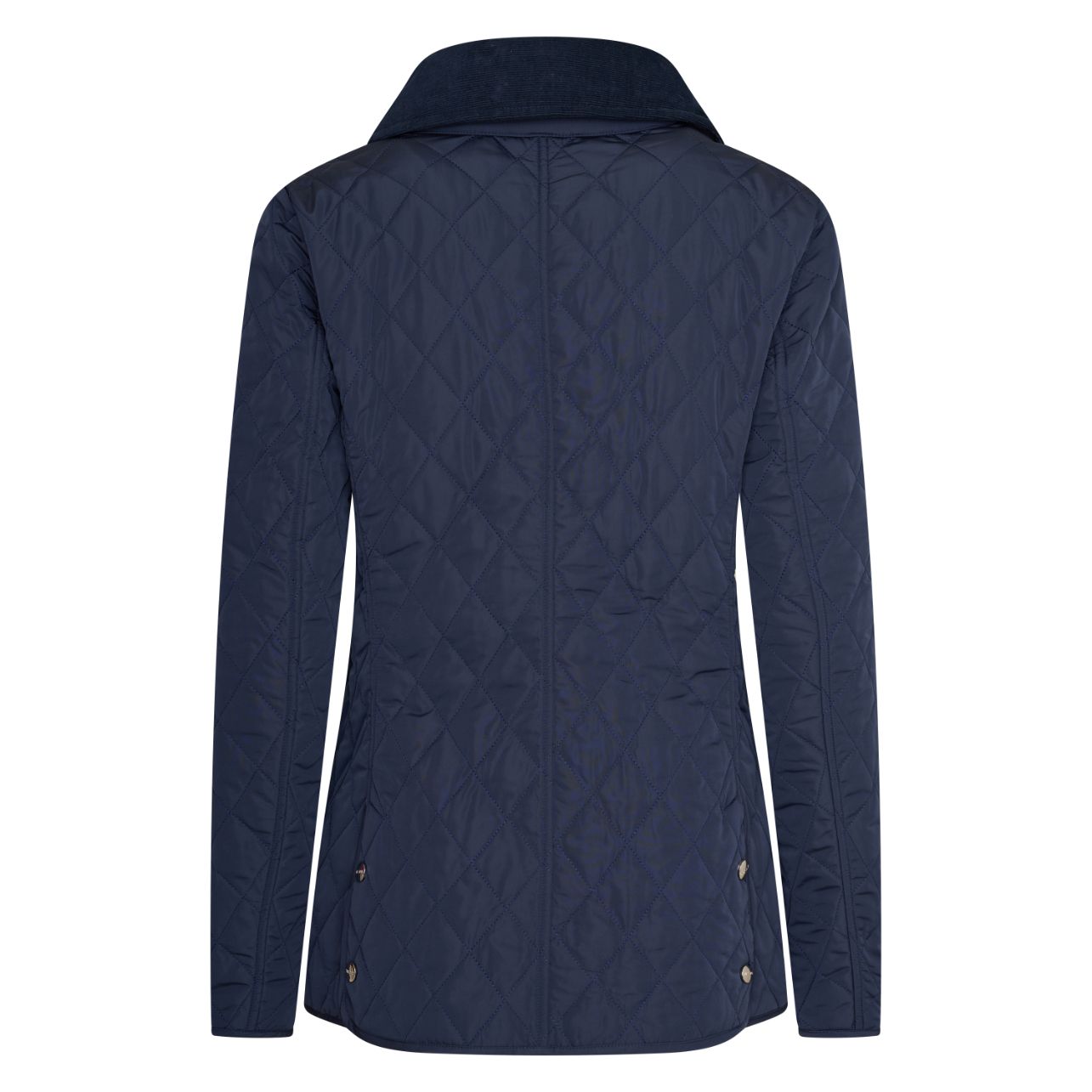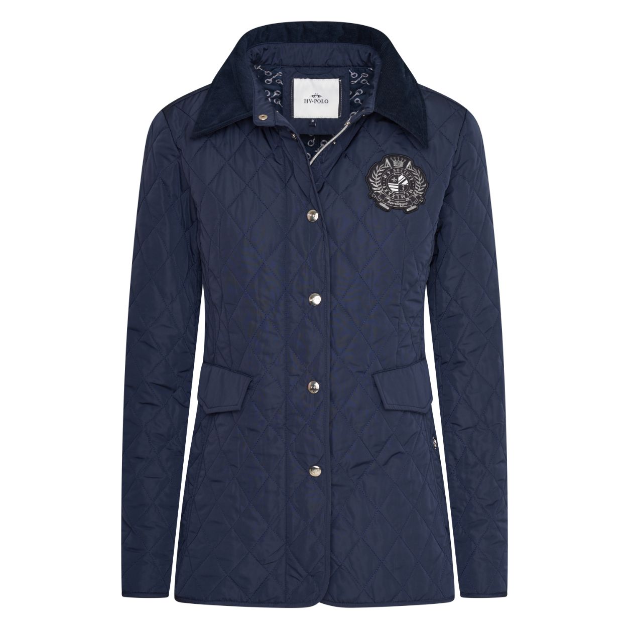 * Quilted jacket * 2-Way zipper closure at front * Welt pocket with flap * Fancy badge at chest * Fake down padding * 2 Slits at backside with snap buttons * Collar of baby rib material * HV Coin * Placket with snap buttons * Lining with metal horse bit allover print