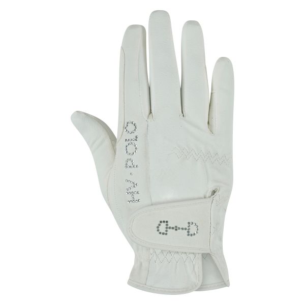 Classical riding gloves with two combi-materials * Small stone artwork on the closure and index finger * Phone finger touch function