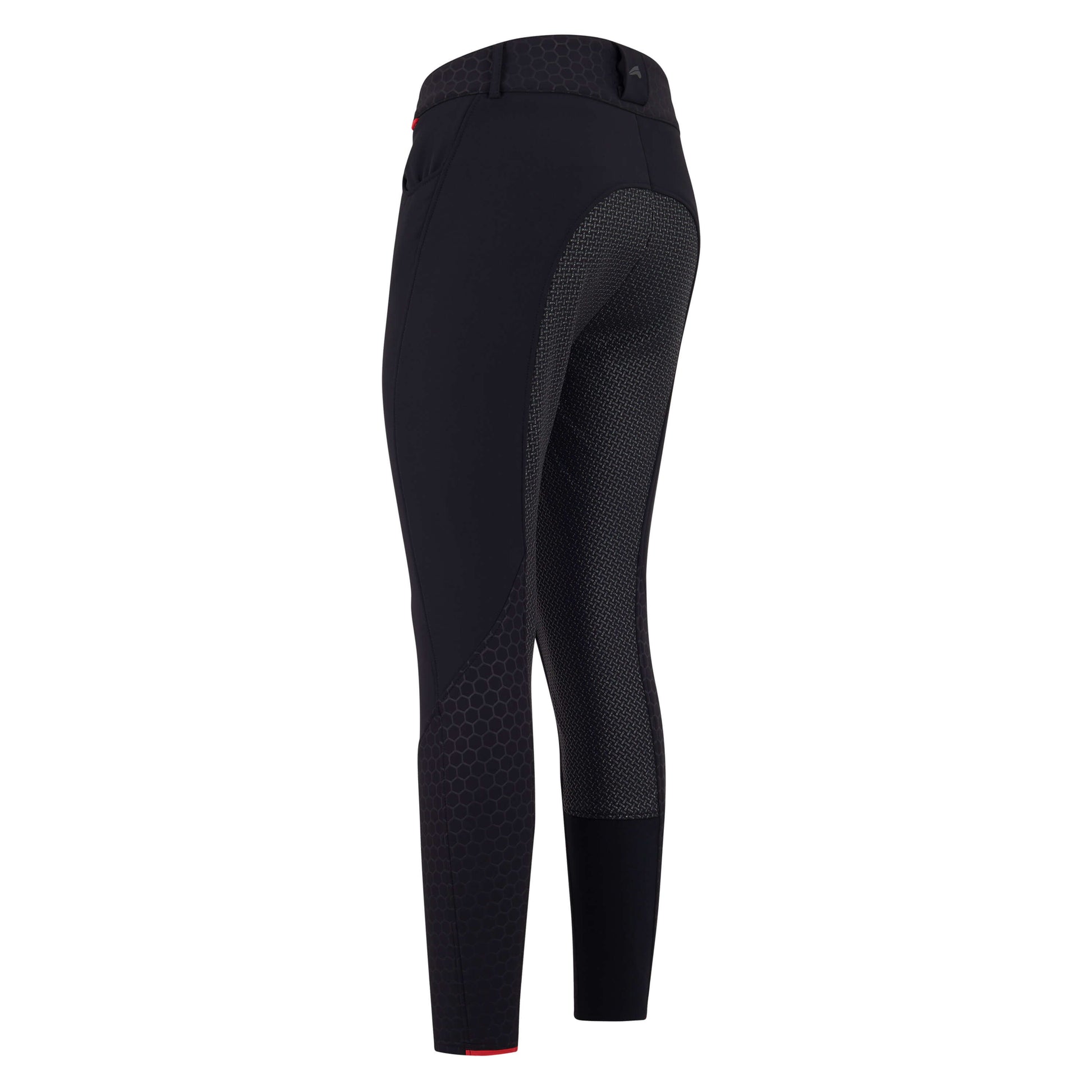 Modern breeches made of functional material in tech look with honeycombs. These breeches are made of durable 4-way stretch fabric with special wind, water, and dirt repellent properties. Even in chilly temperatures, these breeches will keep you pleasantly warm. The Allure ladies’ breeches feature an extra high waist band with belt loops. The back look is embellished with the euro star logo. Two inserted pockets with curved opening at the front. Curved side seams flatter the feminine figure. Modern tech look thanks to the honeycomb pattern on the waist band and the lower leg. The fullseat is made of silicone. A small euro star print can be found on the outer side on the right knee. The elastic leg ends feature a small red stripe in a contrasting color.