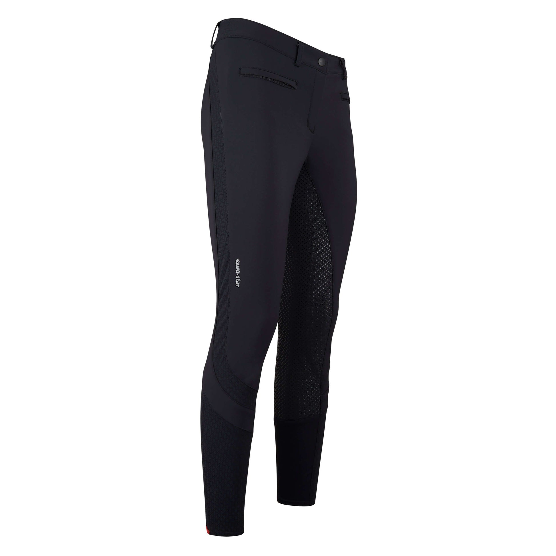 The sporty and elegant full-seat ladies’ breeches are made of durable, dirt and water repellent 4-way stretch. In addition to this, this functional material also dries extremely quickly. The waist band of the Bess Riding Breeches has belt loops, and it is cut slightly higher in the back. The extra-wide belt loop features the euro-star logo at the back. On the front, there are two horizontally inserted front pockets with simple piping and a covered zip. The full seat has been applied in a rice pattern. A subtle, vertical euro star print can be found on the outer side above the right knee. A wide, curved decorative seam runs vertically along the outer leg. A narrow red stripe in a contrasting colour can be found on the leg ends.