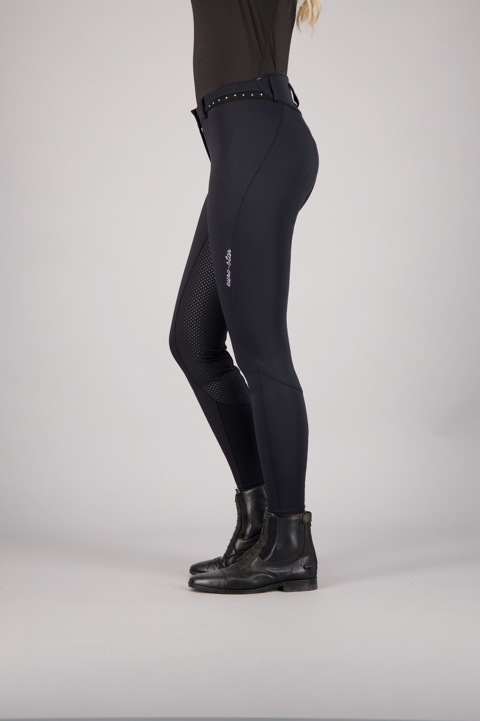 The ESEquitation Queen breeches with the famous euro-star Queen shape are now back with a diamond upgrade. These breeches make the rider look and feel like a queen whilst riding. The innovative cutting and seaming technique aims to optimally shape the female silhouette. The ergonomic waistband, adapted perfectly to the body, is cut higher at the back for better support and lower at the front for maximum freedom of movement. The shape of the FullGrip and the positioning of the seams highlight the female curves. Not to be missed – a phone pocket on the right thigh is cleverly hidden with a small zipper. The stunning rhinestone appliqué on the lower waistband and euro-star logo lettering on the thigh, give these breeches a particularly glamorous look. These breeches are made from a 4-season, durable microfiber, which is stain- and waterresistant. Finished with elastic leg ends for extra wearing comfort.