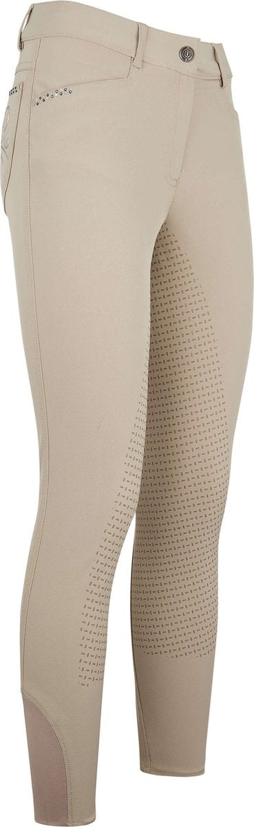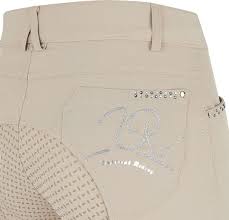 Fancy riding breeches in material of our top seller breeches Isidro. Beautifull rhinestones at front and back pockets. Backpockets with lucky clover shaped sequins and nicely embroidered logo. With silicone fullseat.