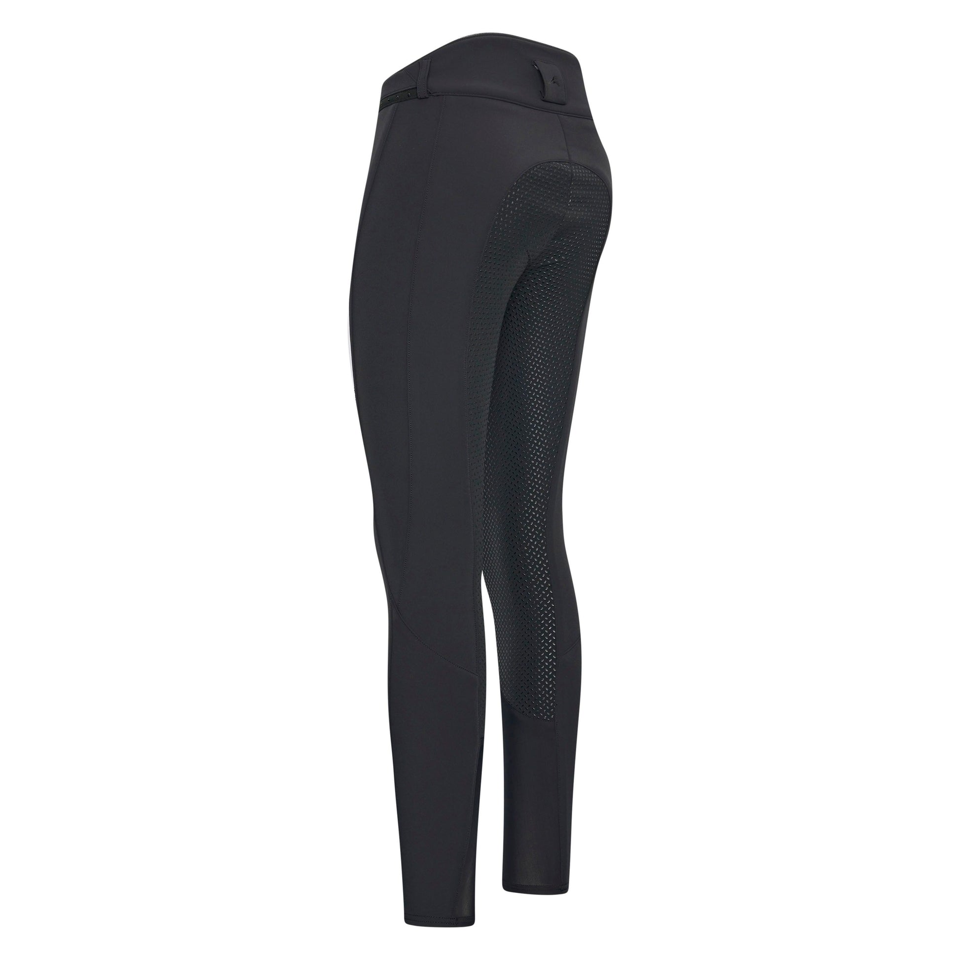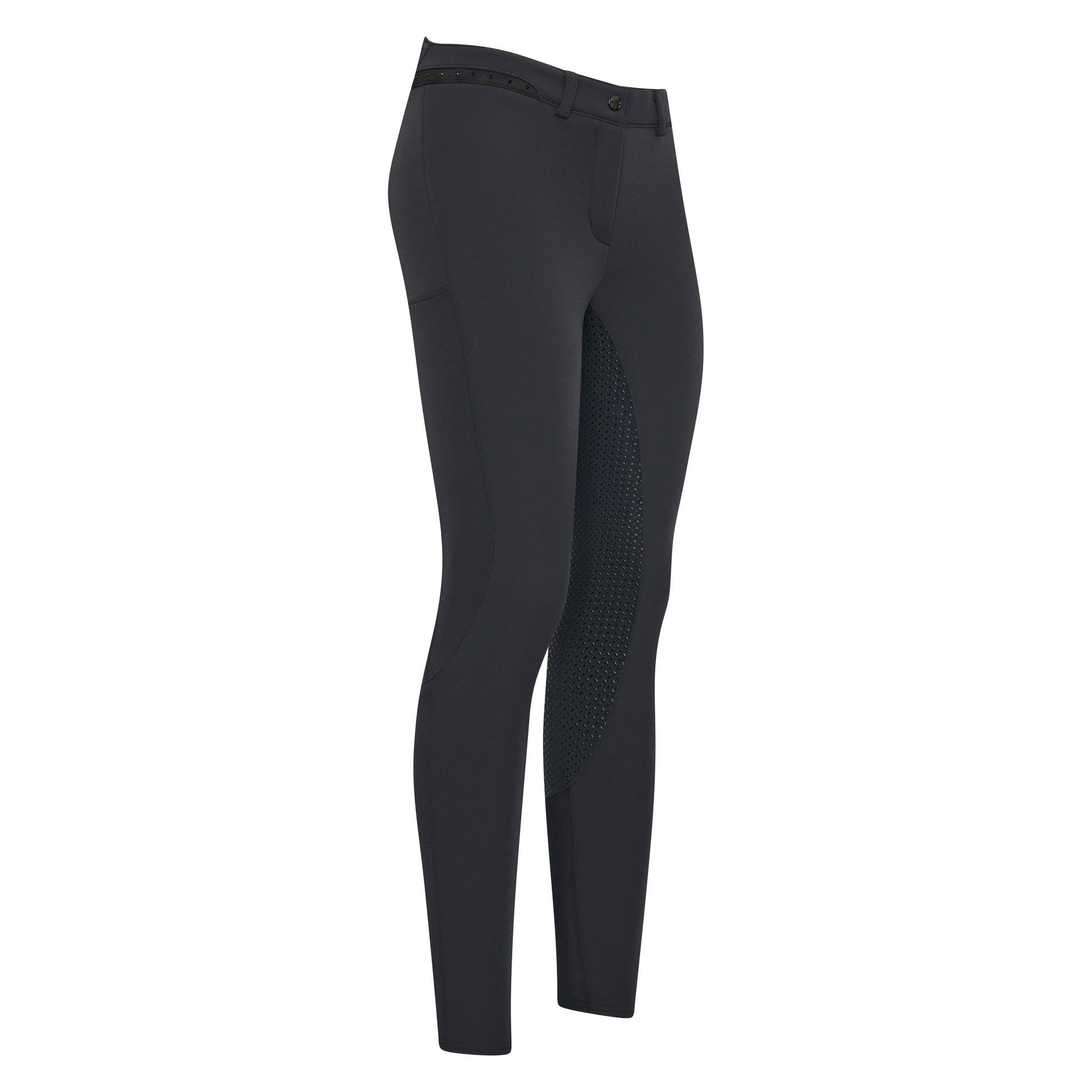 The ESEquitation Queen breeches with the famous euro-star Queen shape are now back with a diamond upgrade. These breeches make the rider look and feel like a queen whilst riding. The innovative cutting and seaming technique aims to optimally shape the female silhouette. The ergonomic waistband, adapted perfectly to the body, is cut higher at the back for better support and lower at the front for maximum freedom of movement. The shape of the FullGrip and the positioning of the seams highlight the female curves. Not to be missed – a phone pocket on the right thigh is cleverly hidden with a small zipper. The stunning rhinestone appliqué on the lower waistband and euro-star logo lettering on the thigh, give these breeches a particularly glamorous look. These breeches are made from a winter quality fabric to protect against cold weather environment. Finished with elastic leg ends for extra wearing comfort.