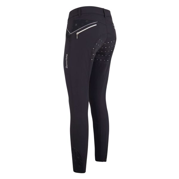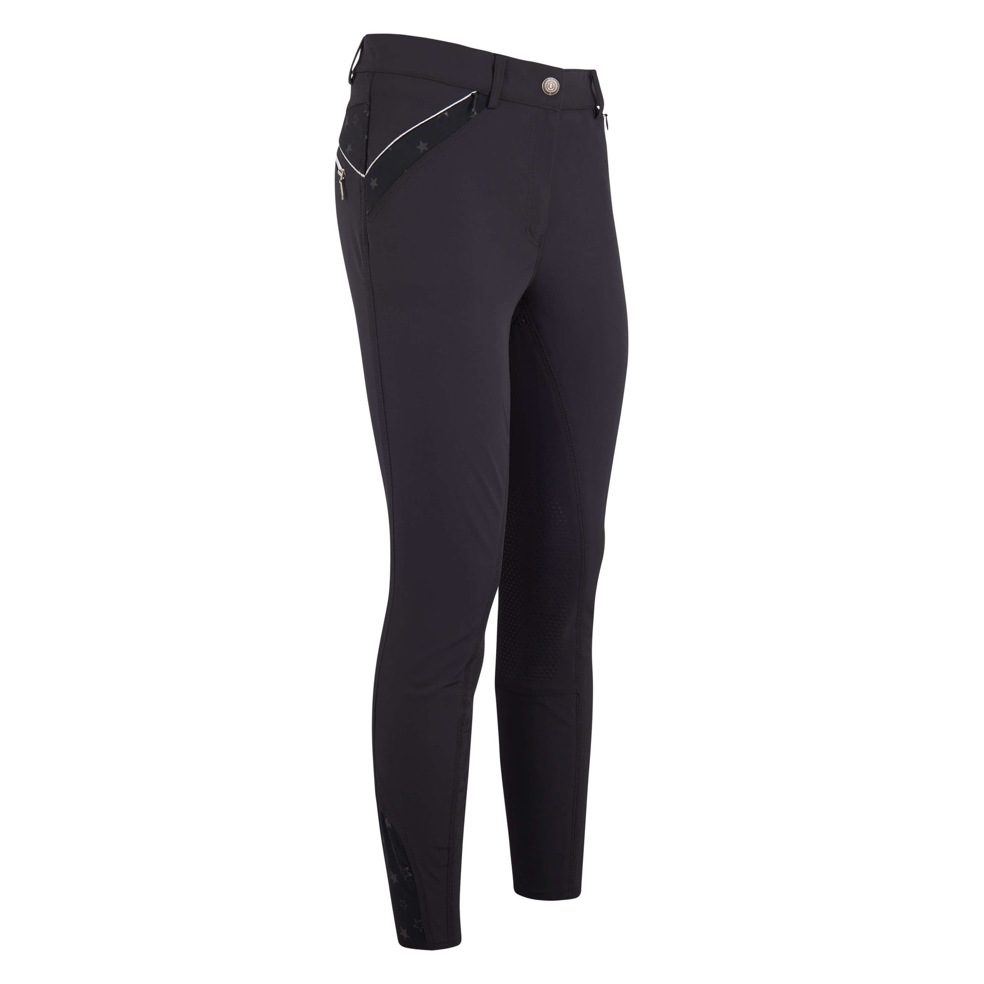These comfortable breeches combine a perfect fit with sophisticated design. The silicone print on the seat is embellished with silver stars whereas the silicone on the inside of the legs is matte. The star motif can be found everywhere: on the elastic net inserts on the lower end of the legs as piping on the zipped pockets on the front of the garment and as decoration above the rear zipped pockets. On the left leg the marking on the side is displayed in shiny letters. Thanks to the Flexlegs you no longer have to close your breeches at the bottom. The 2-way stretch fabric is particularly comfortable to wear.