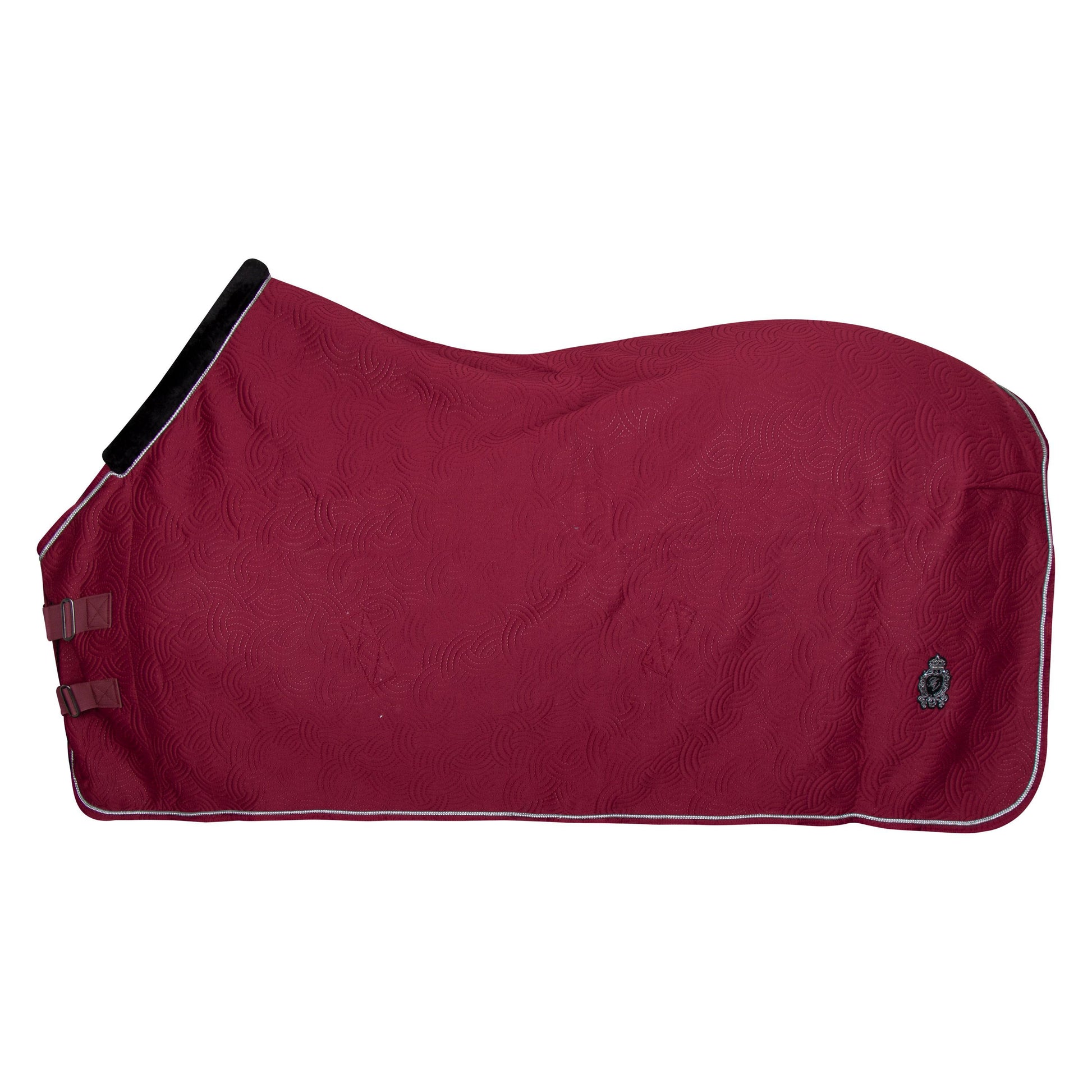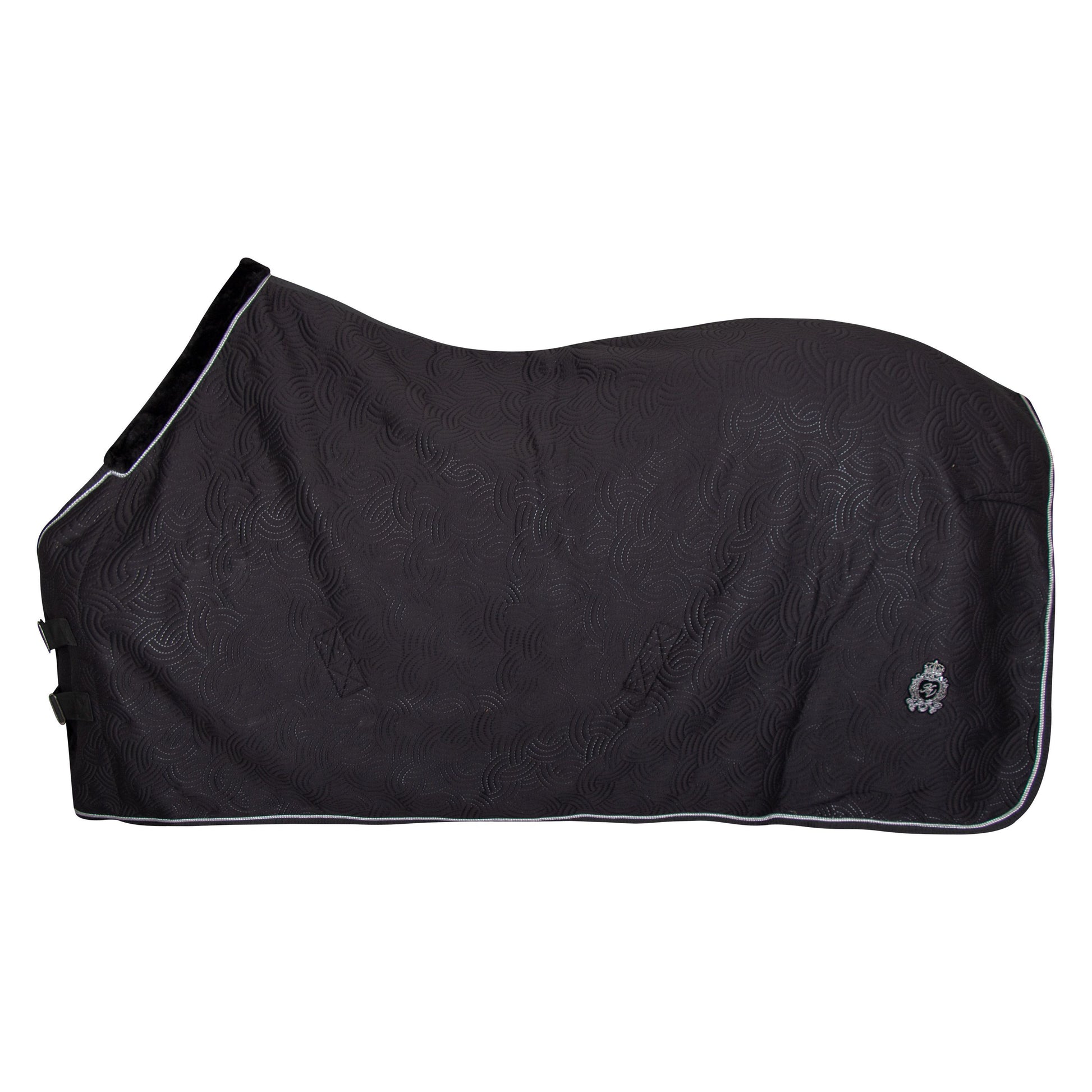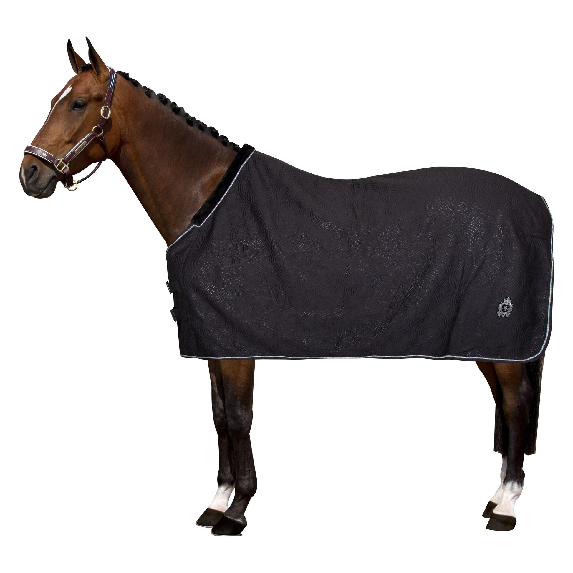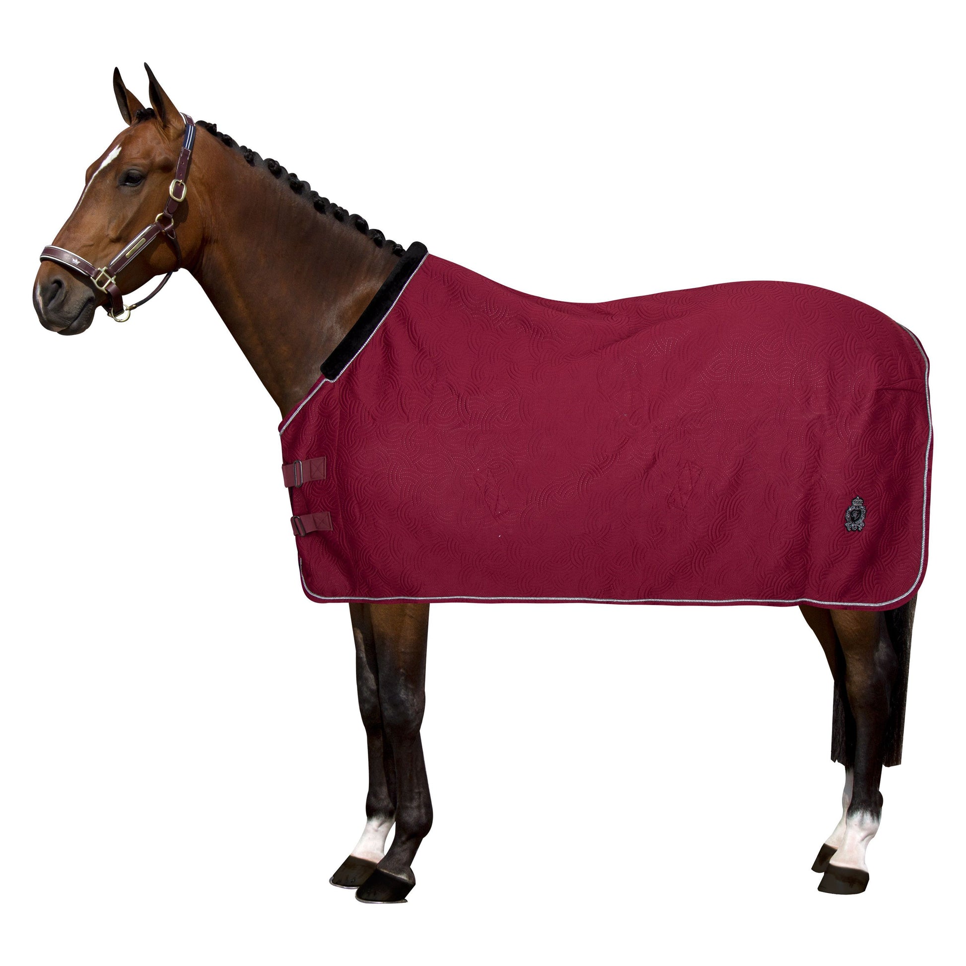 Transport blanket made out of bonded material which has a very nice quilting. With luxury velvet badge and fancy rope along the bindings. With extra long fur at withers and neck for protection. With double T-lock front closure, tail cord and on both sides detachable cross surcingles. With Fancy lurex rope along the binding and luxury black nickle hardware.