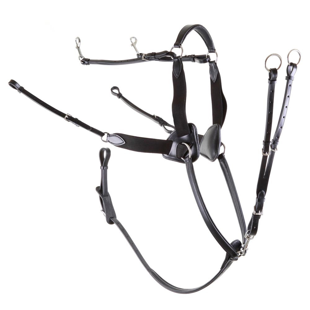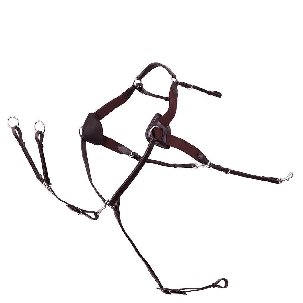 The Premiere breastplate is a five point leather breastplate with elastic inserts. The breastplate has an adjustable girth attachment loop with buckle closure and includes a removable, adjustable martingale attachment. The martingale part has soft padded lining. The breastplate has elastic running from the shoulder to the wither and from the shoulder to the saddle flap to improve comfort and freedom of movement. In addition, the breastplate has adjustable leather straps with snap hooks, to fix it to the D-rings at the front of the saddle. The triangular shoulder pads ensure extra comfort. The breastplate is fixed to the billets with adjustable leather straps with buckle closure. The breastplate is fitted with stainless steel fittings. A breastplate is used to stabilize the saddle and prevent is from slipping, particularly when eventing and jumping.
