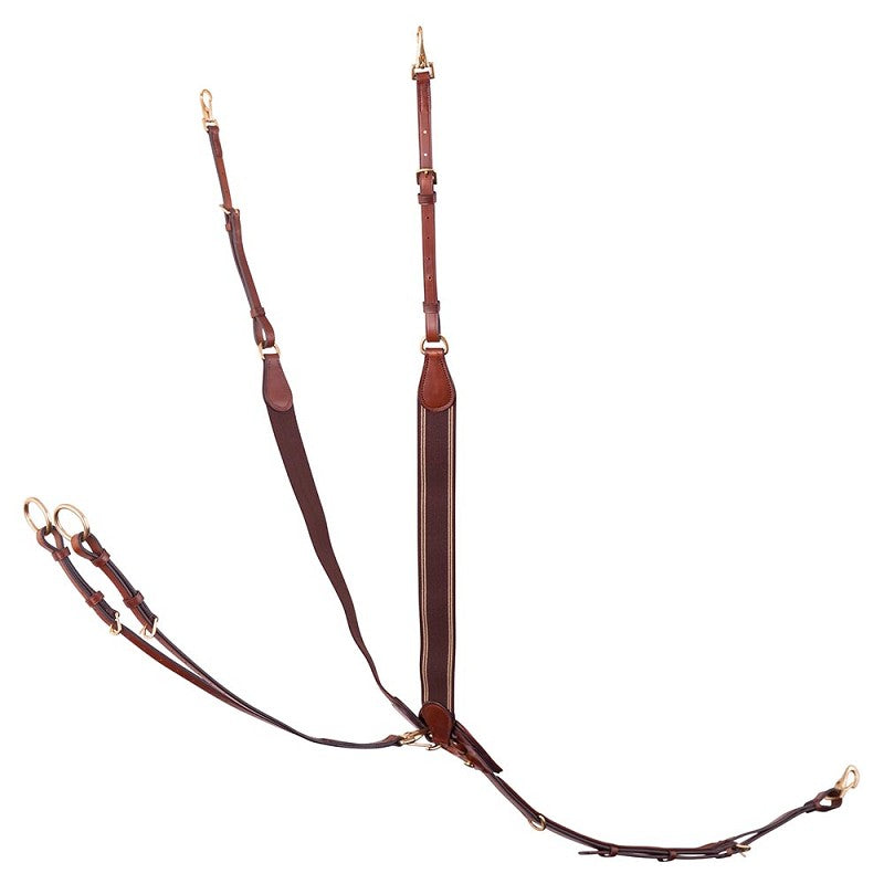 Leather breastplate with elastic in the neck strap and a leather martingale attachment. The breastplate has many adjustment possibilities and can easily be attached to the saddle with snap hooks, the martingale attachment is also easy detachable with a snap hook. The breastplate is made of the best full-grain European leather. This kind of leather is strong, supple, feels soft and is durable. Most parts have a soft leather facing and the breastplate is beautifully finished, with high-quality stainless steel buckles. The breastplate prevents the saddle from sliding backward, especially by jumping. This is also a problem with very round horses and a breastplate can be useful. The martingale which can be attached, prevents the horse from throwing its head.