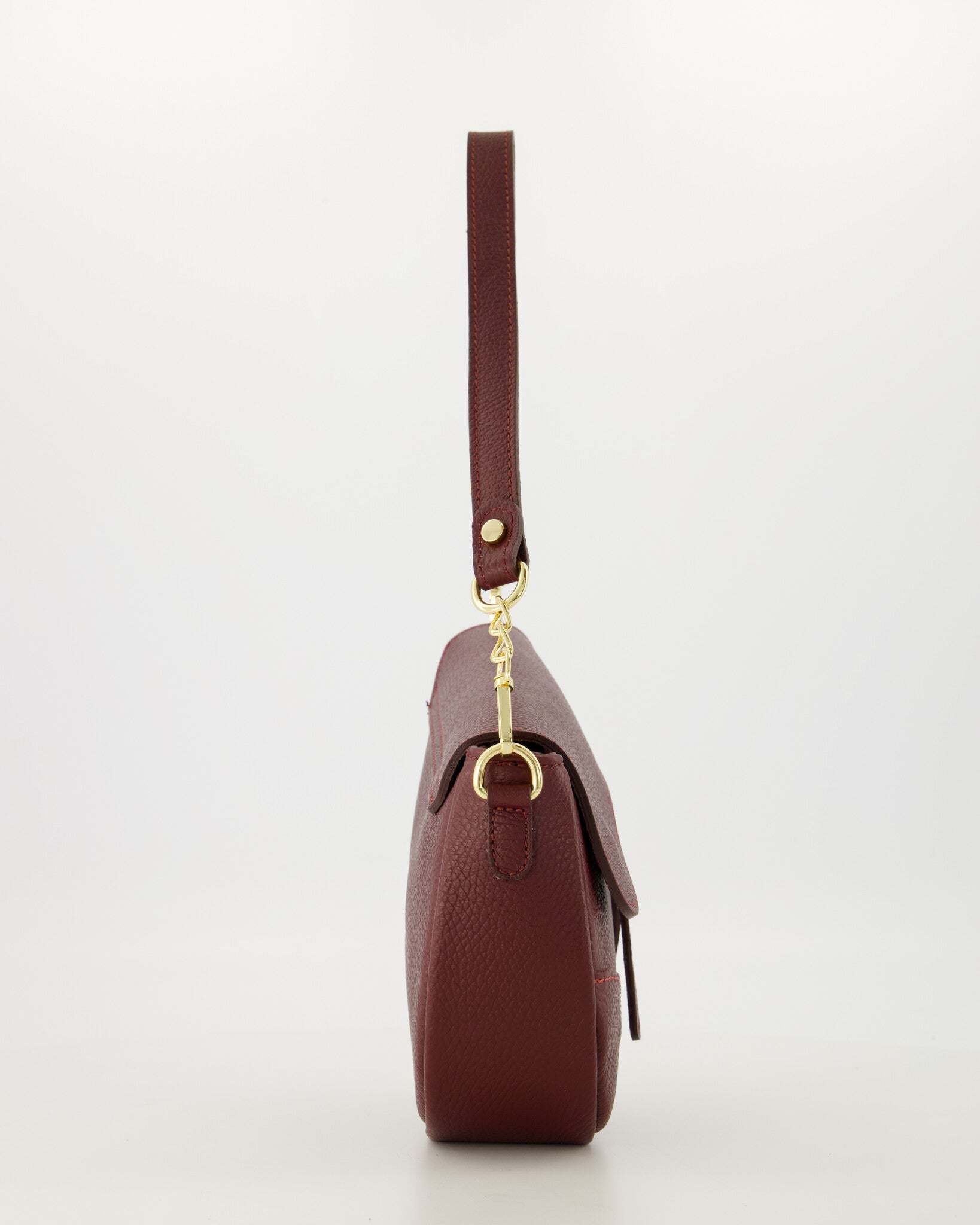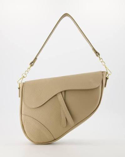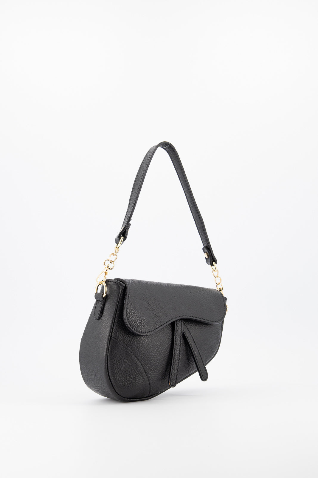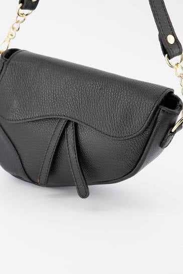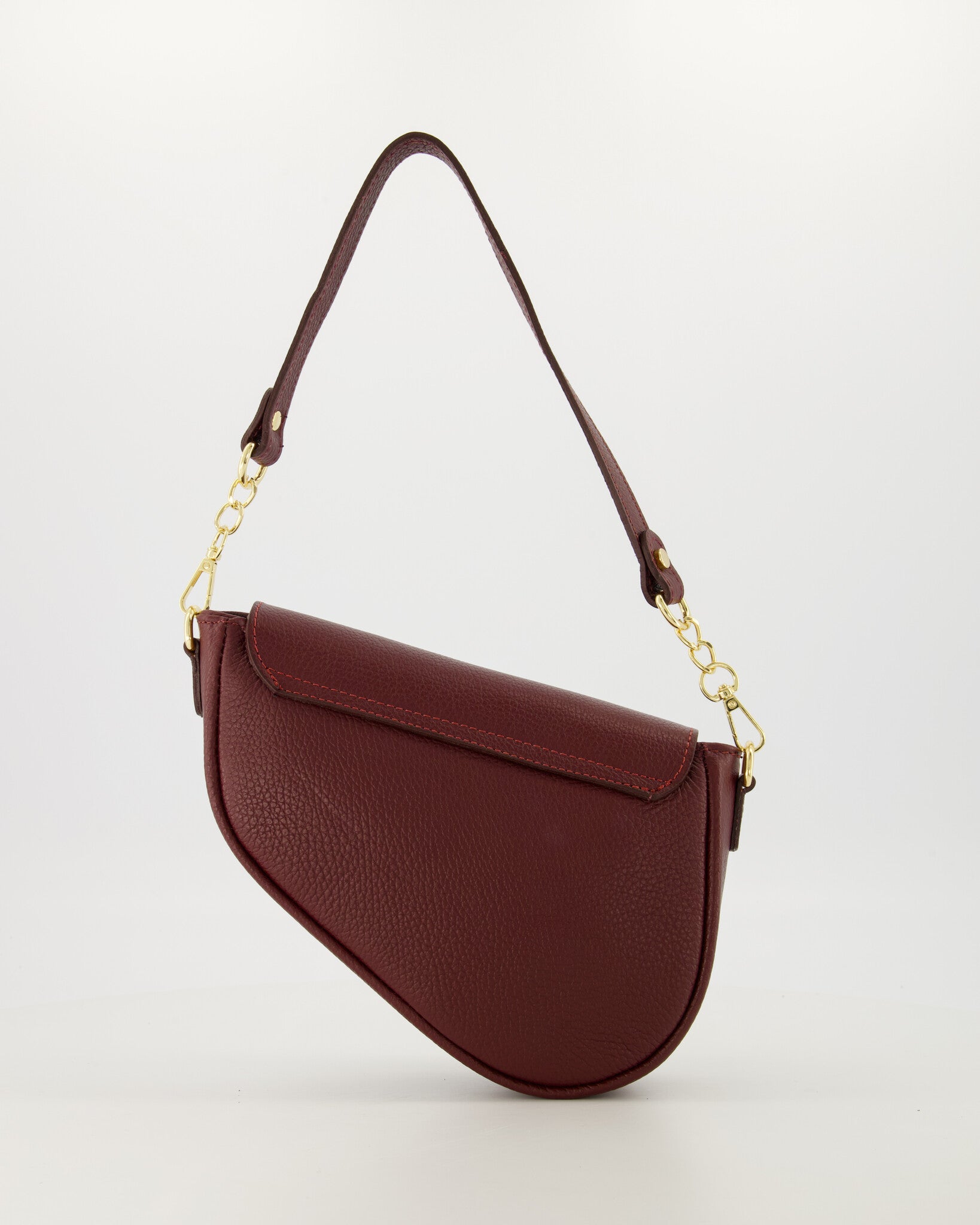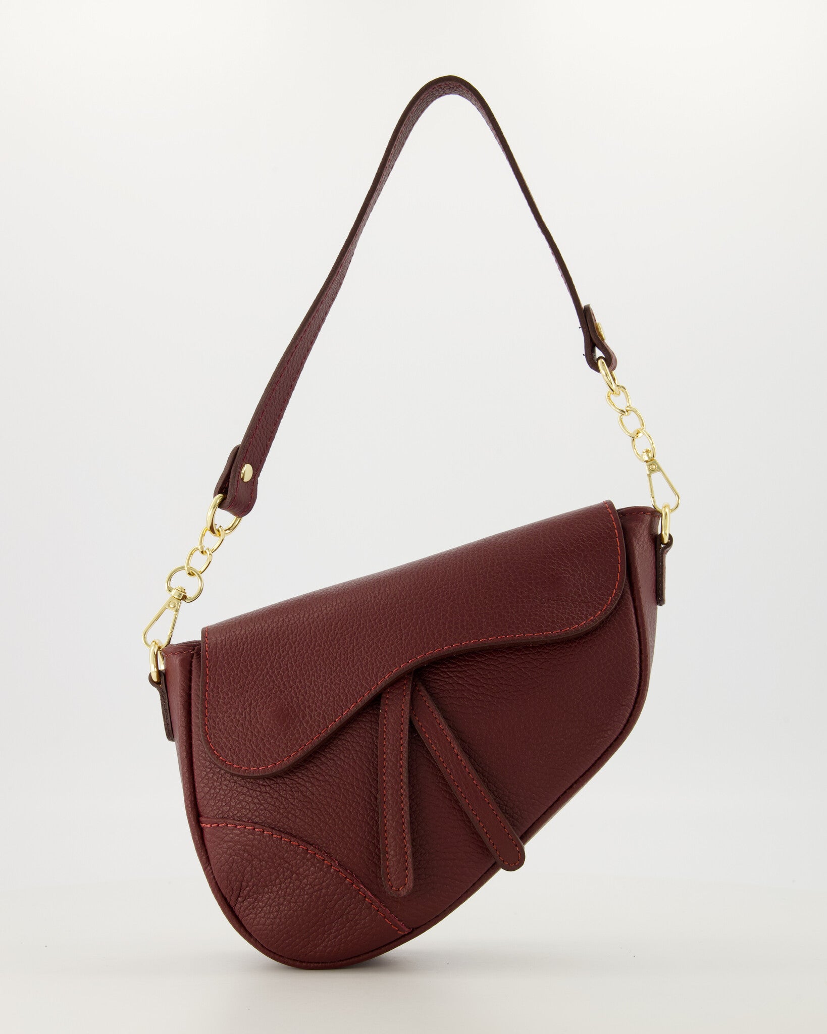 This saddle-shaped bag is made of grain leather. The bag has two handles, a shorter one to wear as a handbag and a longer adjustable handle to wear as a crossbody bag. The crossbody bag has gold-colored hardware and is closed with magnetic closures. On the inside there is a pocket with a zipper.