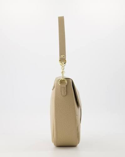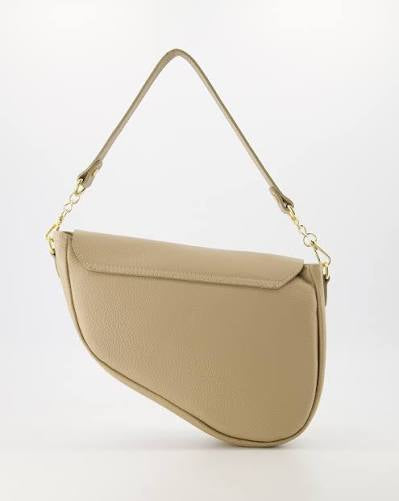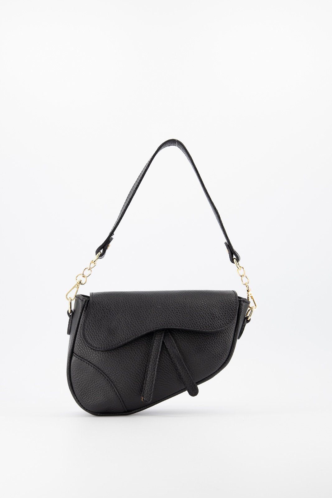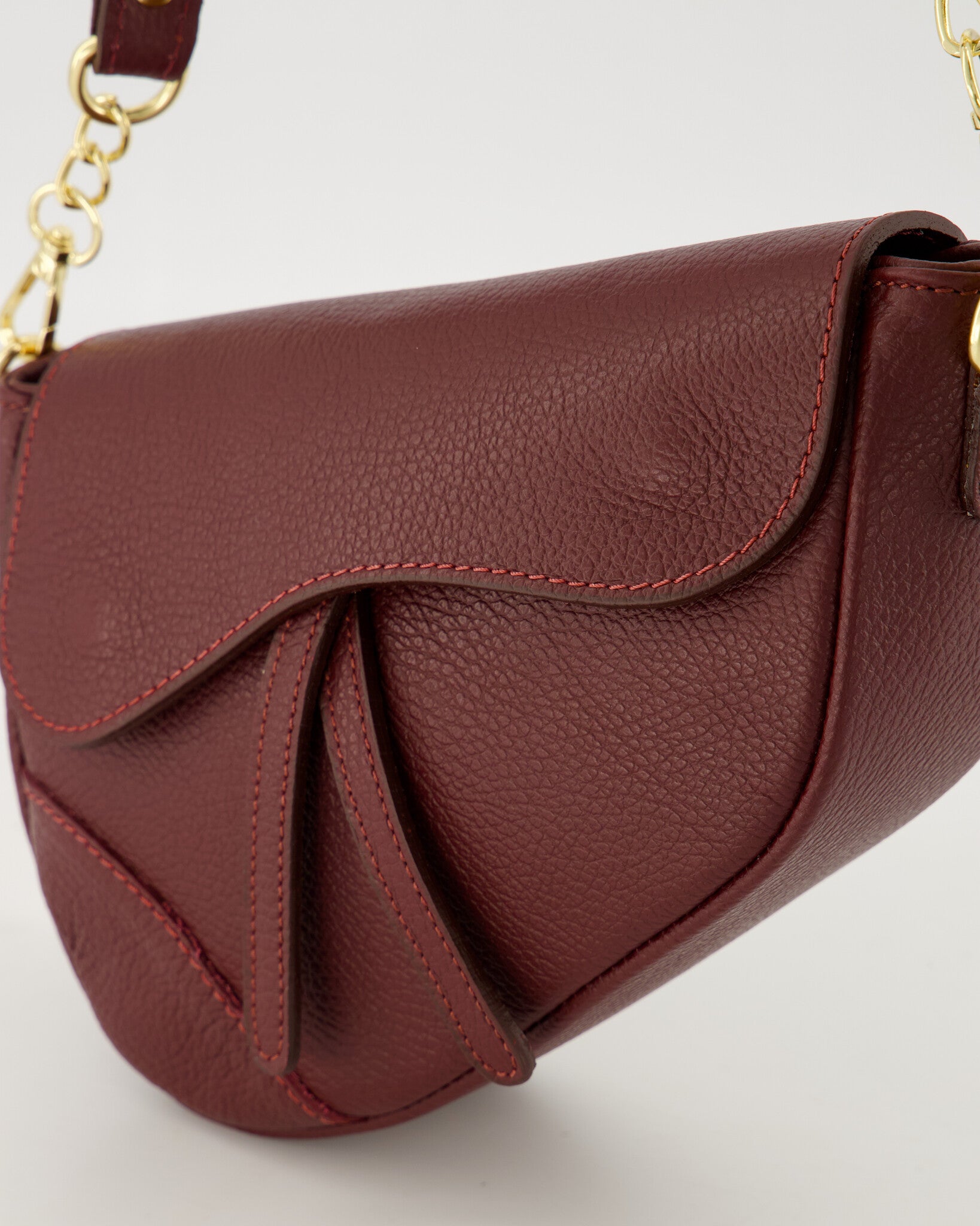 Această poseta în formă de șa este fabricată din piele naturală. Geanta are două mânere, unul mai scurt pentru a fi purtată ca geantă de mână și un mâner mai lung, reglabil, pentru a fi purtată ca geantă crossbody. Geanta crossbody are accesorii aurii și se închide cu magnet. În interior există un buzunar cu fermoar.