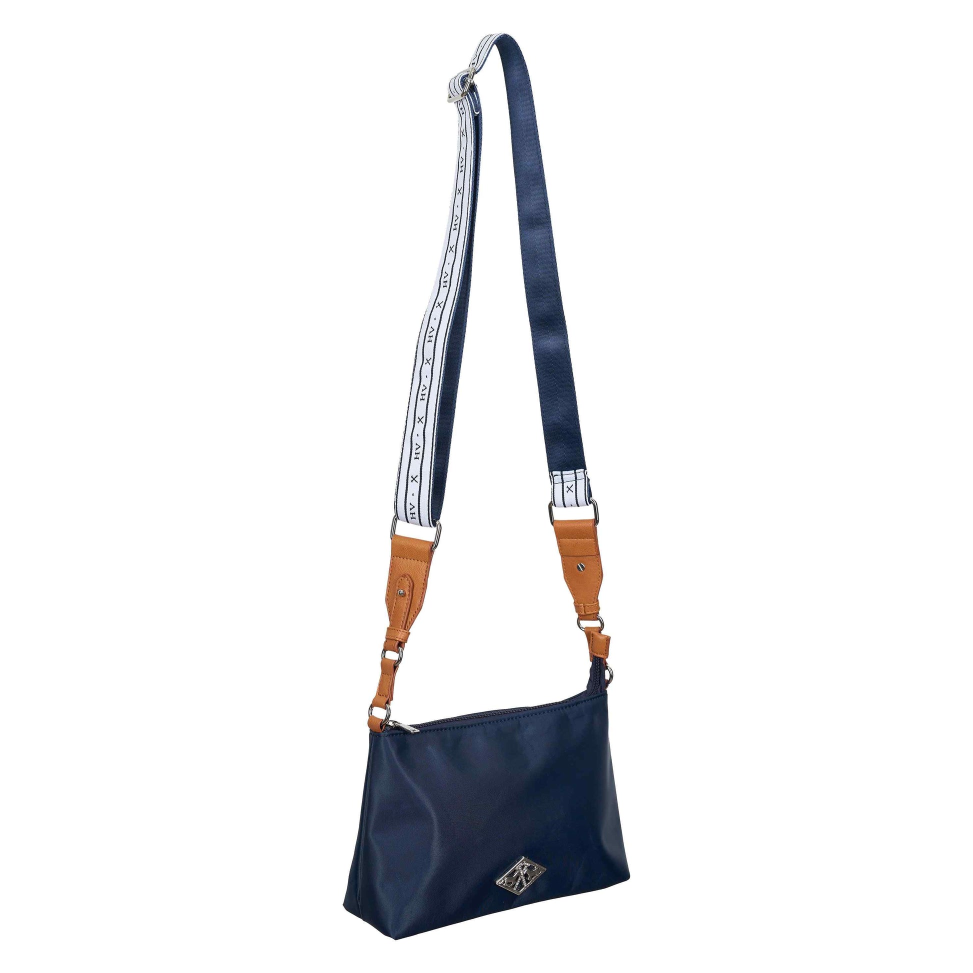 * Small vegan leather handbag * Logo tape strap with vegan leather details at edges * Fancy metal logo plate with rhinestones * At back extra pocket with zipper * Zipper on top with branded puller * Adjustable and detachable strap * Width 25 cm/ height 18 cm / depth 6 cm