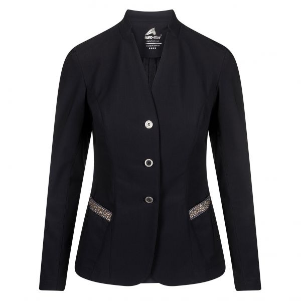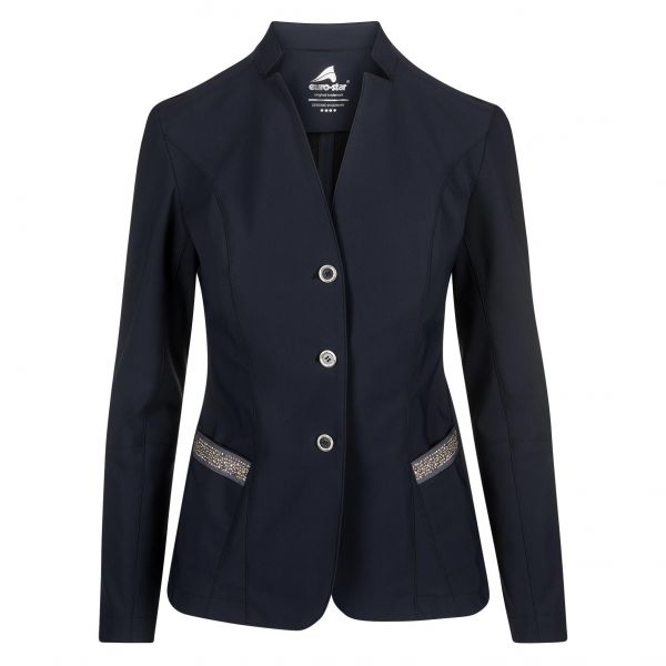 This beautiful ladies competition jacket makes a big impression in the competition ring. The short cut and the slim fit ensure that you look good during all maneuvers, while you enjoy a high wearing comfort thanks to the light and pleasantly fitting material. The excludesly designed stand-up collar is very special and complements the other details of this modern jacket, such as the high-quality buttons and the practical pockets at the front, the edges of which are decorated with numerous glittering rhinestones.