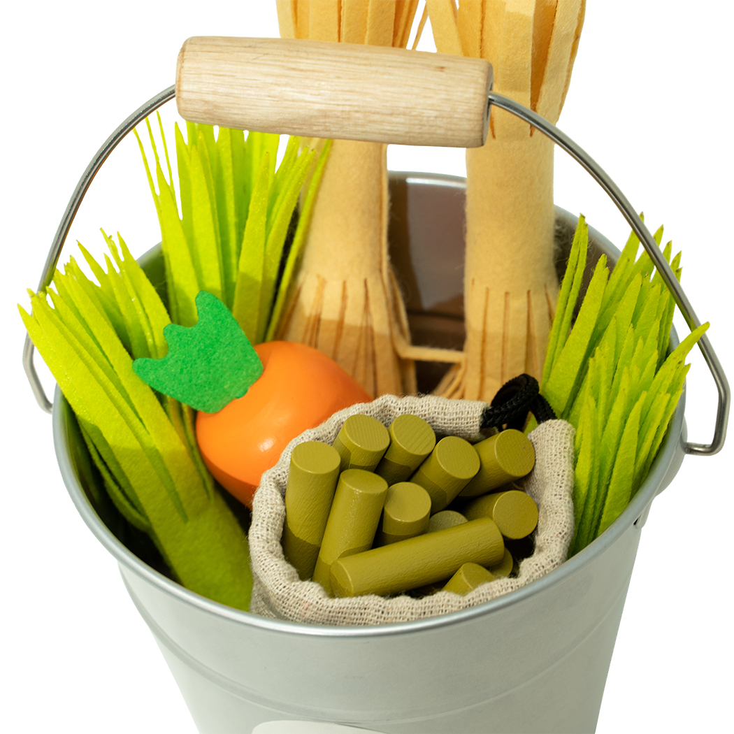 All the elements in a suitable size so that a child's hand can easily grasp them. The set contains a lot of goodies for the horse that will entertain the child's role-play for many hours: straw, grass, salt stones, carrots, apple, horse pellets, treats and sugar cubes.