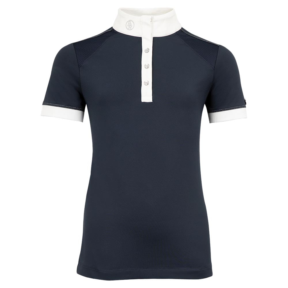 Acest tricou pentru echitatie, de competitie elegant și elastic pentru copii cu mâneci scurte iese în evidență datorită plasei din față, cusăturii argintii contrastante și celor trei butoane cu sclipici. doi nasturi ascunsi pot fi găsiti la guler.