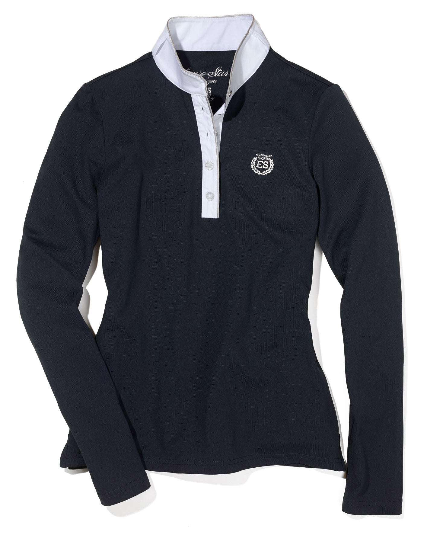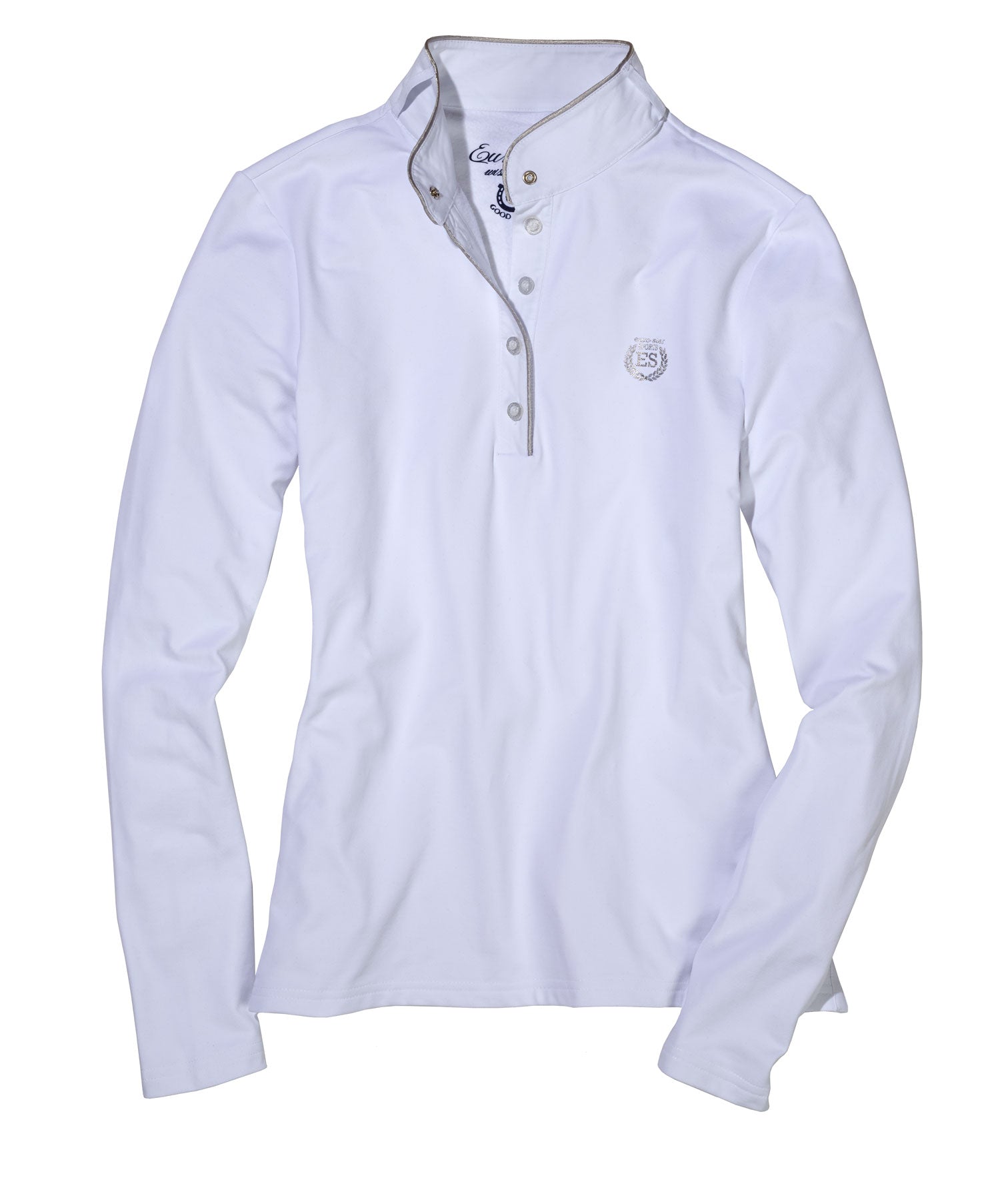 Ladies turniershirt made of hight elastic and breathable microfiber piqué with soft fl eece inside, woven collar, rhinestone elements and fashionable details.