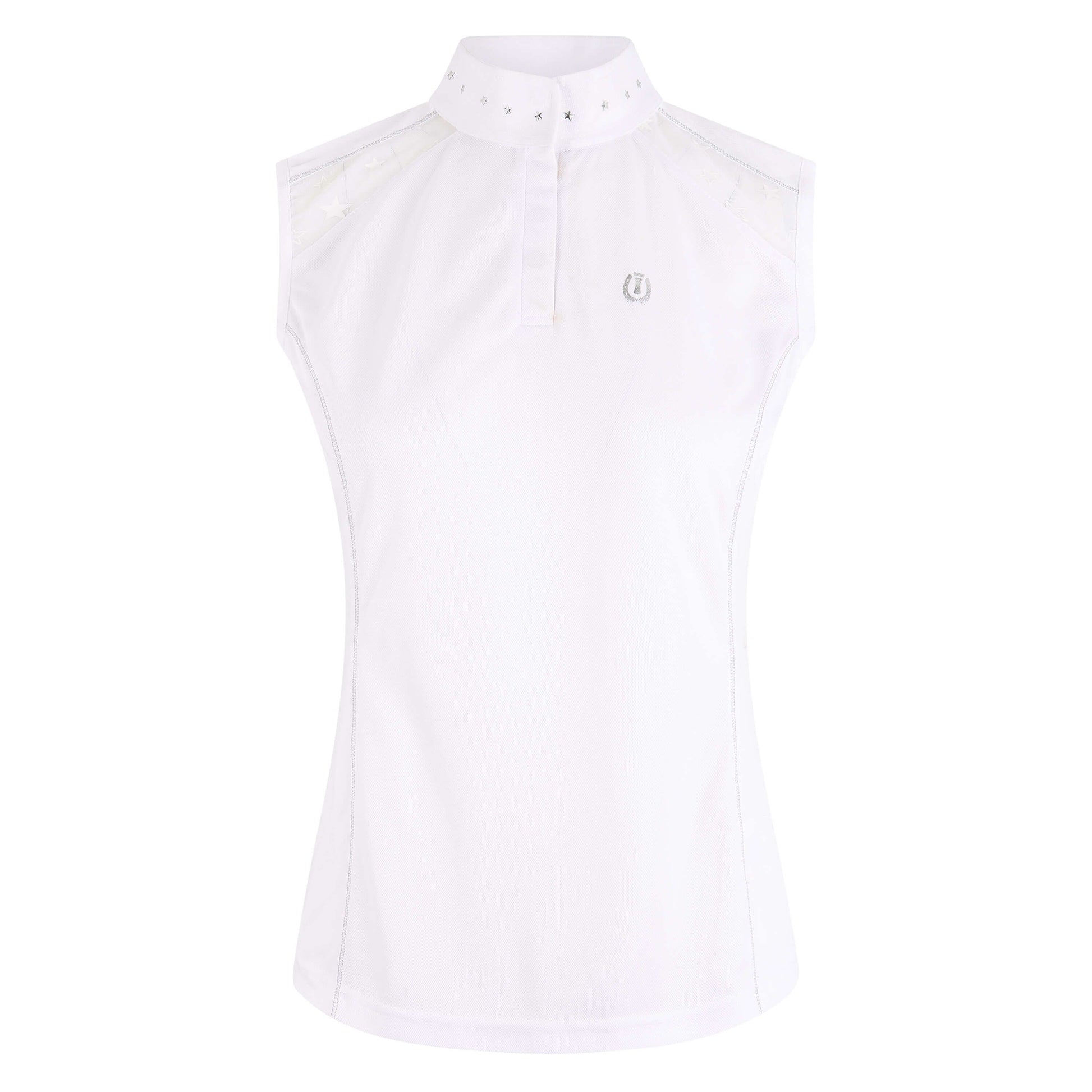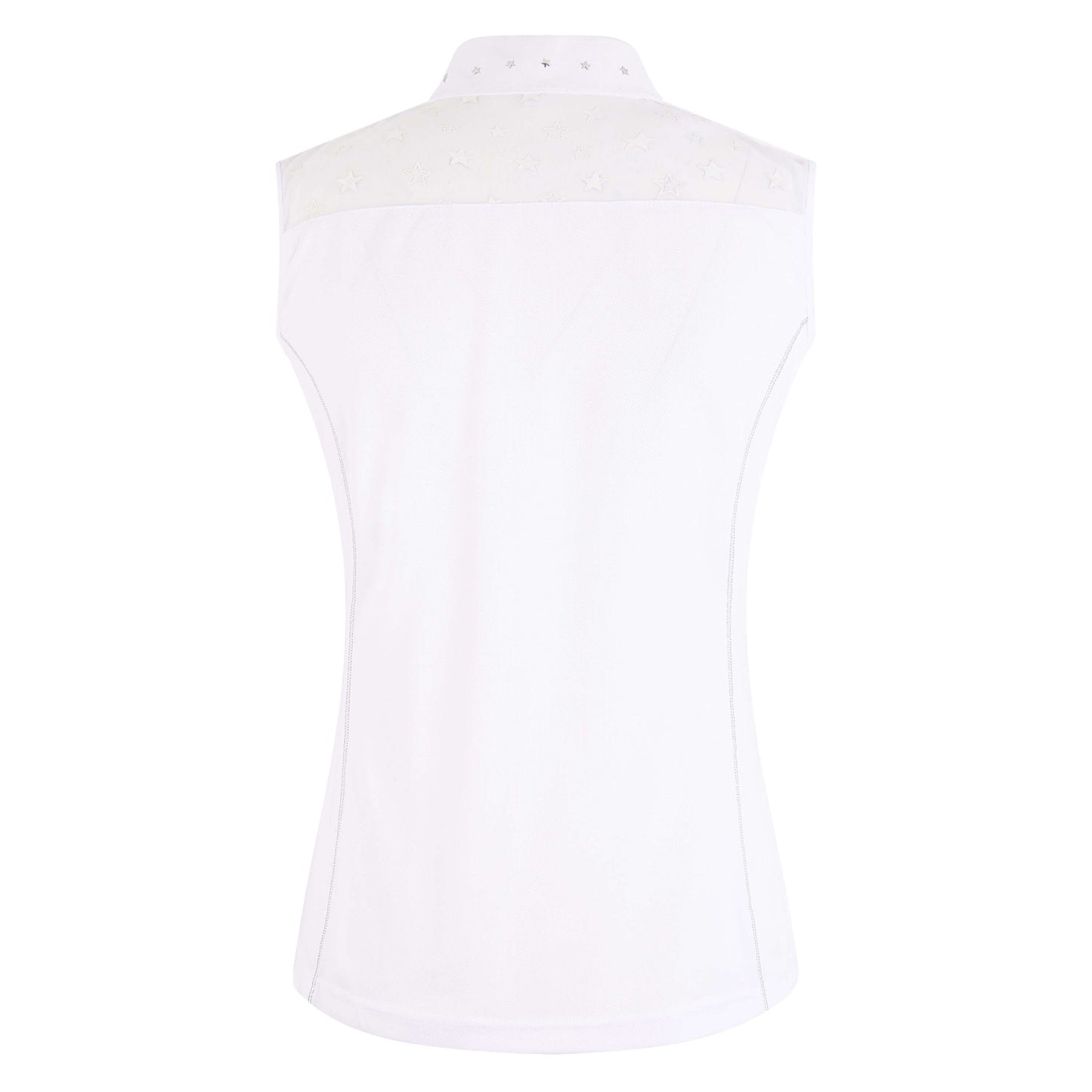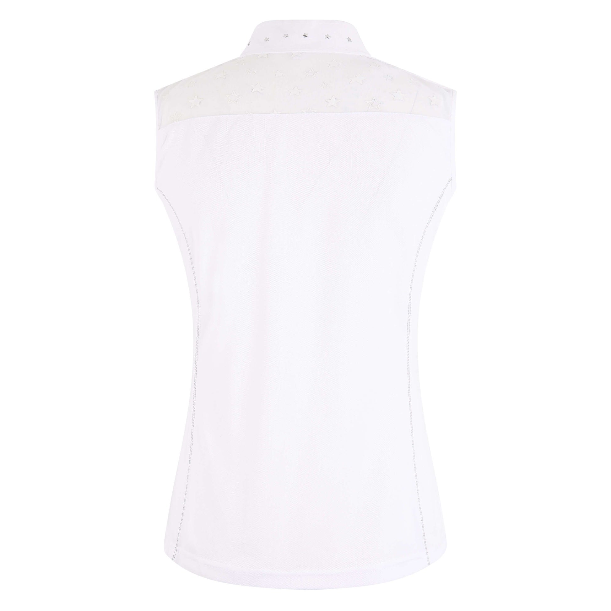 Sleeveless tournament shirt in a feminine design, made of a functional material. This top fits elegantly, and it features shiny seams. The elastic tone-in-tone net inserts on the shoulders and the upper back are embellished with contrasting stars. The stand-up collar features star-shaped rivets in shiny silver as well as a short, blind button closure with push-buttons. This comfortable model is particularly comfortable to wear, and it is made of a wonderfully light fabric that feels soft on the skin. The fabric is breathable, dries quickly, and it is low maintenance. Beautiful model with rounded hem at the front and back.