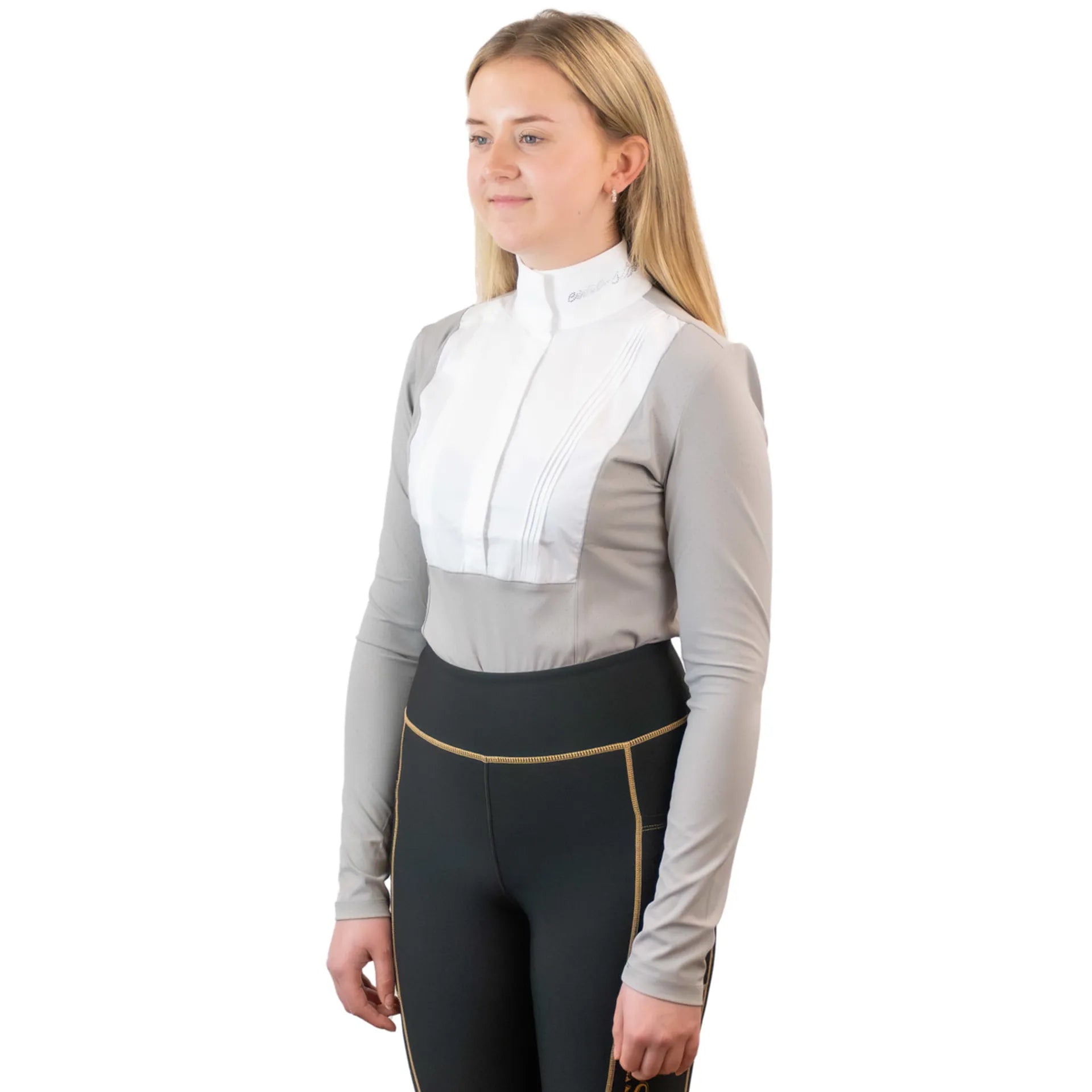 High-end competition shirt with shaped pleated cotton insert on centre front * Perforated jersey providing ventilation * Stand-up collar (6 cm high) with refined rhinestone artwork * Clean finishing with taped seams * Blind placket with snap buttons