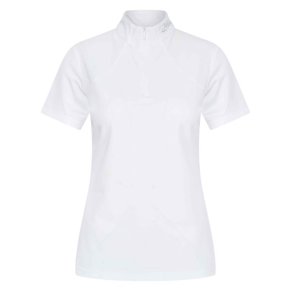 Short sleeve top in mesh fabric with collarstand * On collarstand at left side is a logo with printed horses and rhinestone sticks * Short blind zipper centrefront