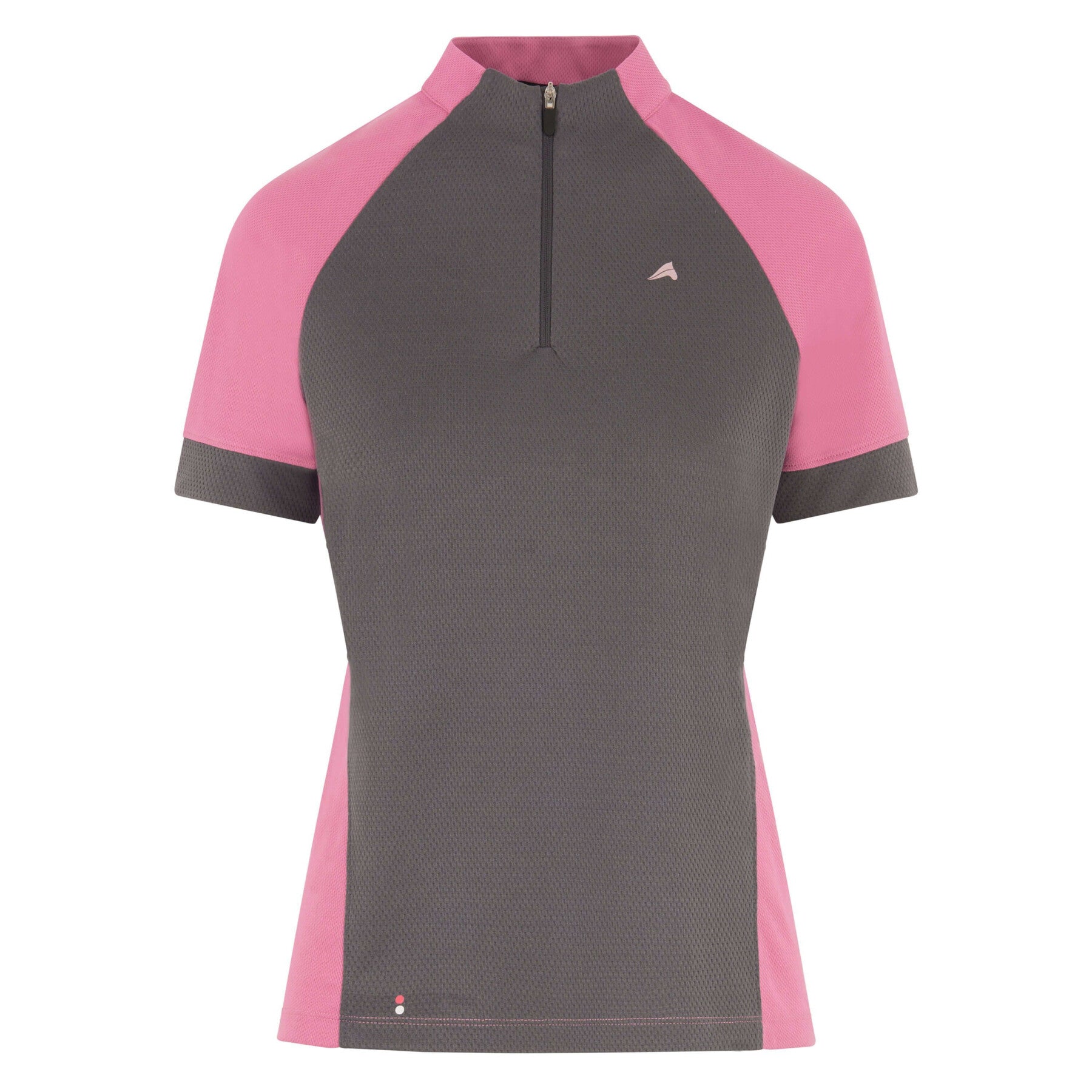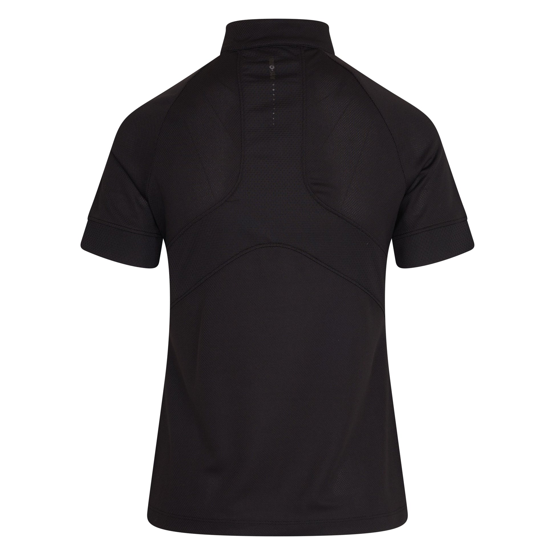 A sporty and fashionable short-sleeved training top with a half-zip under the chin and a small, attached collar. The tight-fitting raglan sleeves feature medium-wide mesh cuffs. The mesh inserts on the front and back are breathable. The shirt comes in a modern design with a combination of shades and contrasting colours. The left side of the chest features a small logo with the stylised horse head. There is also a small sticker above the narrowly stitched-down hem. The back features vertical euro-star lettering between the shoulder blades. The mesh inserts sewn in an eye-catching manner is also on the back of the garment. This shirt is particular breathable and very pleasant to wear.