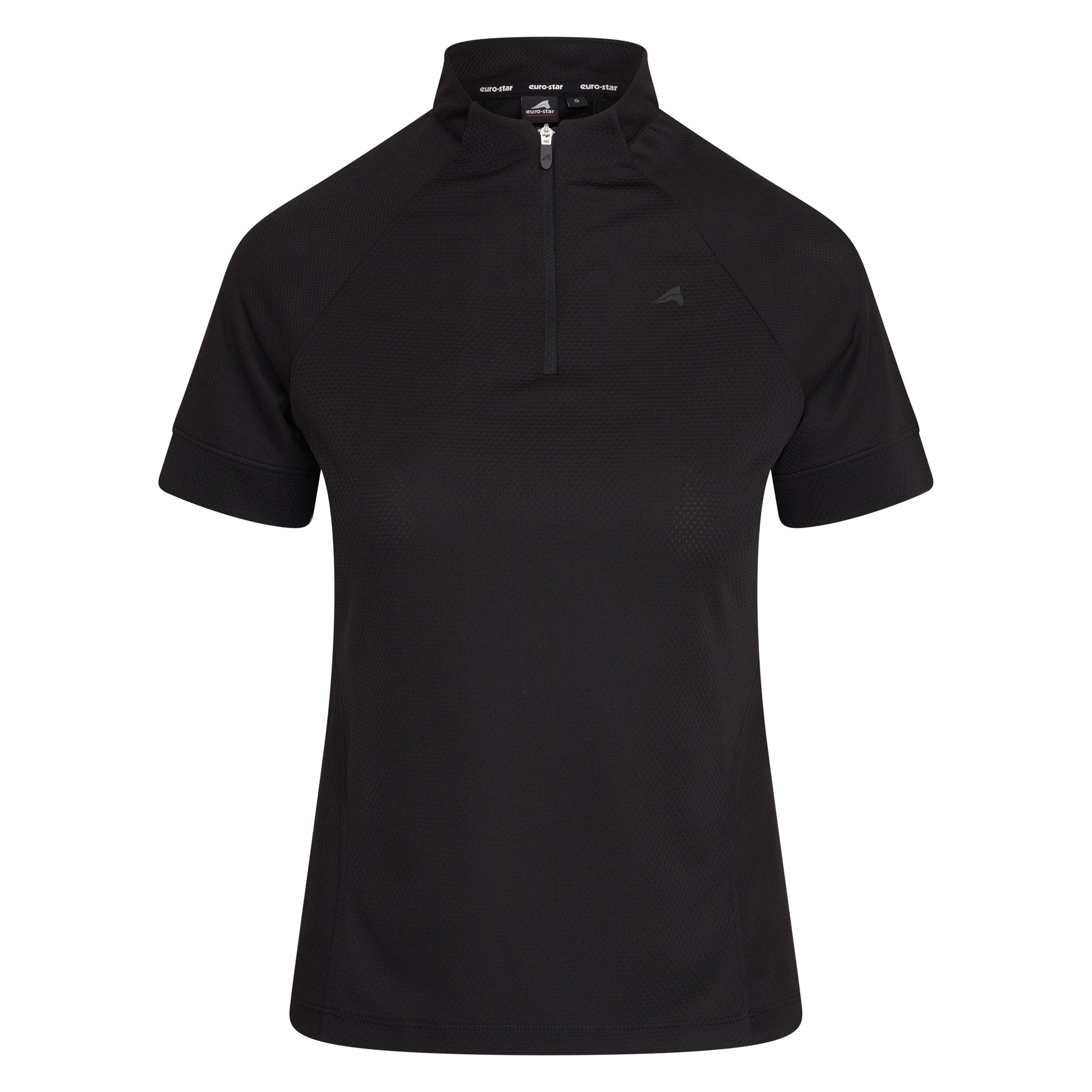 Un top de antrenament sportiv și la modă, cu mâneci scurte, cu jumătate de fermoar sub bărbie și guler mic, atașat. Mânecile raglan strânse sunt prevăzute cu manșete din plasă de lățime medie. Inserțiile din plasă din față și din spate sunt respirabile. Tricoul vine într-un design modern, cu o combinație de nuanțe și culori contrastante. Partea stângă a pieptului prezintă un mic logo cu capul de cal stilizat. Există, de asemenea, un mic autocolant deasupra tivului cusut îngust. Spatele are inscripții verticale Euro-Star între omoplați. Inserția din plasă cusuta într-un mod atrăgător se află și pe spatele articolului de îmbrăcăminte. Aceast tricou este deosebit de respirabil și foarte plăcut de purtat.