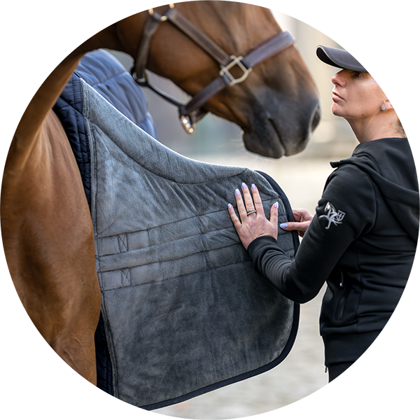 Phase-change materials adjust depending on the horse’s skin temperature. When it rises, they absorb excess heat, maintaining comfort without overheating. When it drops, they release stored warmth, preventing chilling.