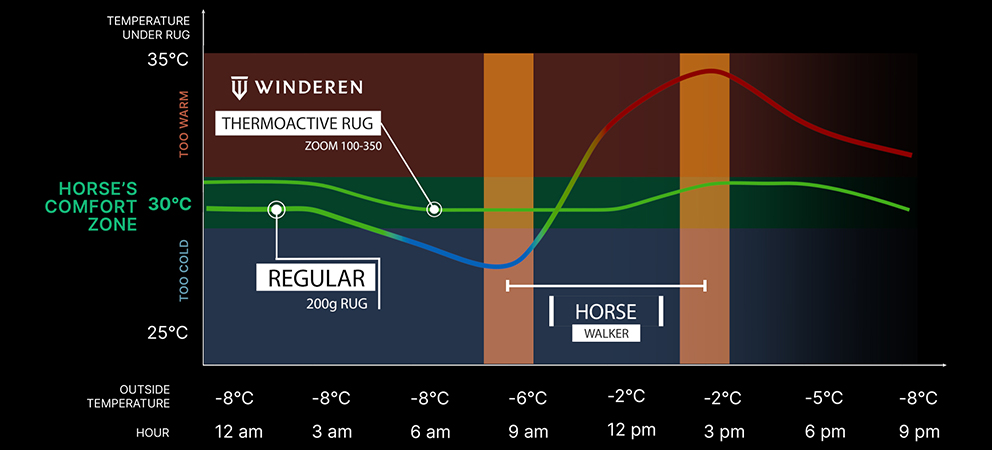 During 7 months of testing (October to April), horses wearing Winderen Thermoactive Zoom 100-350 experienced continuous thermal comfort in outdoor temperatures ranging from -15°C to +17°C, regardless of activity level.