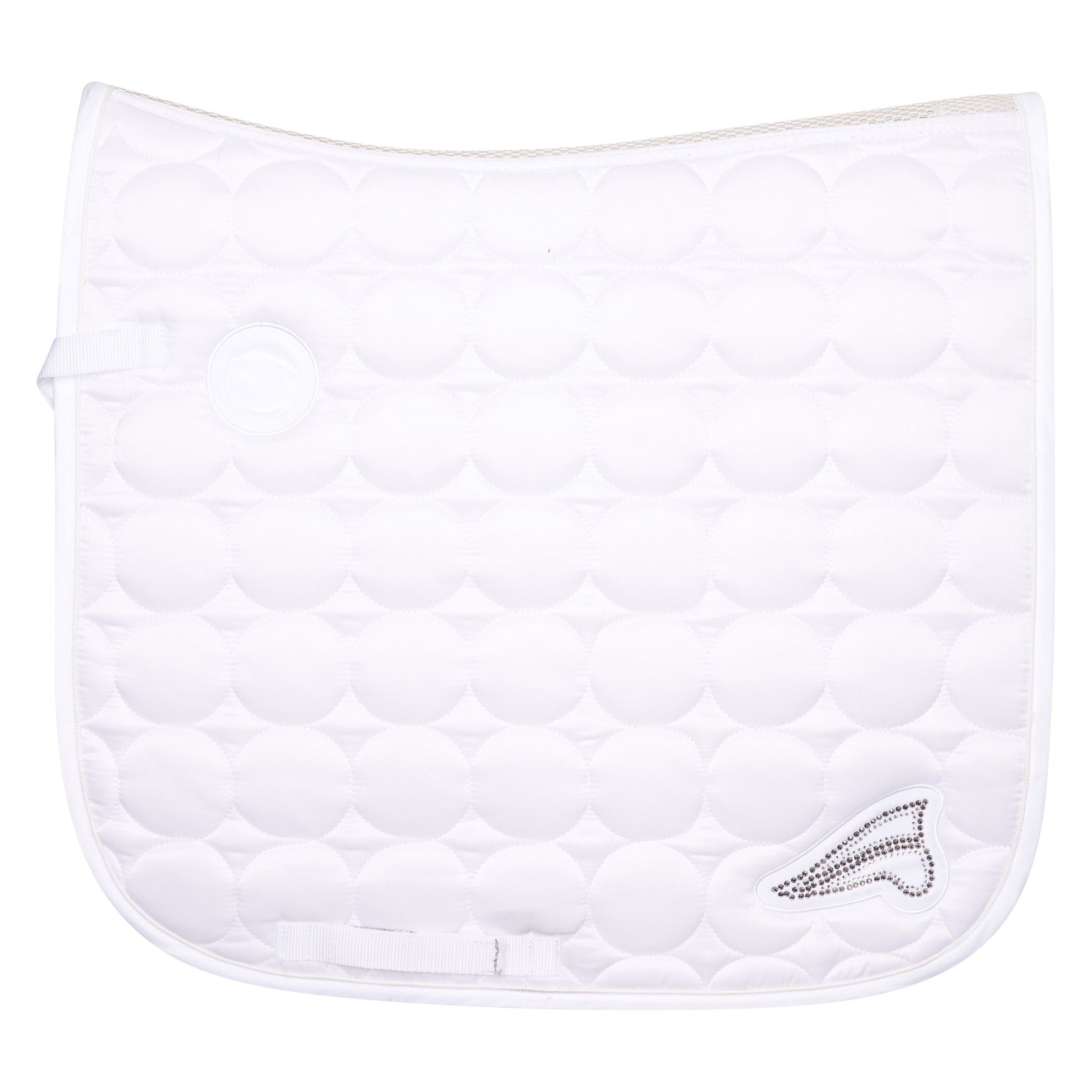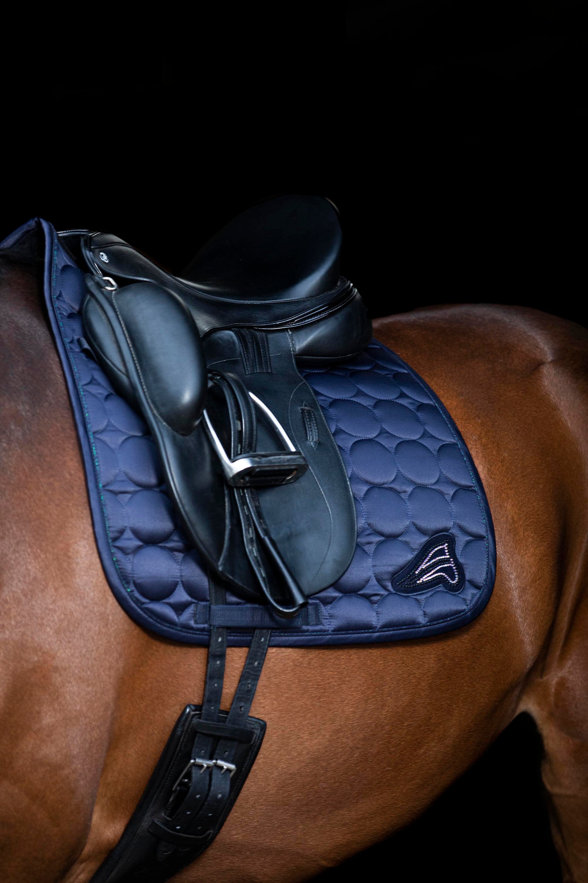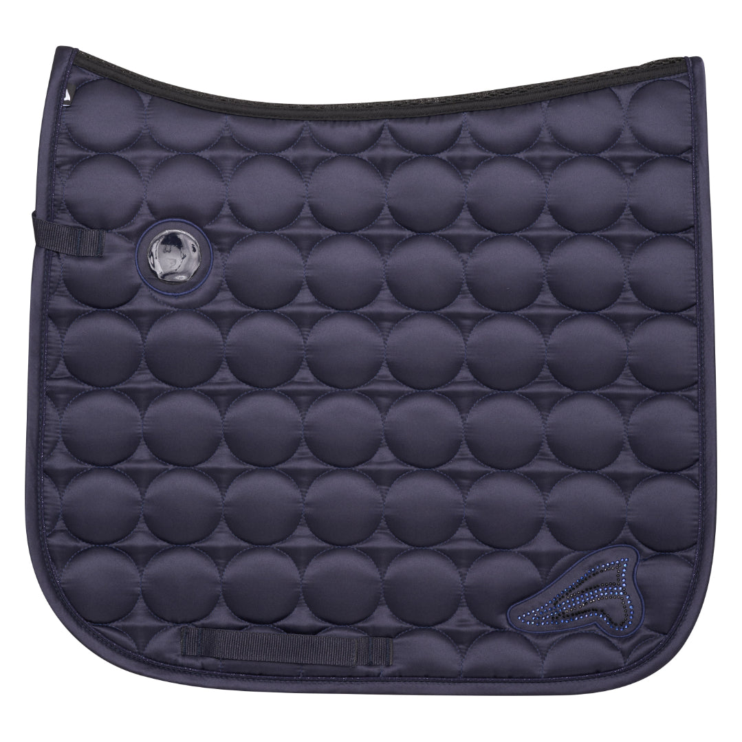 Shiny saddlepad with round shaped quilting. Mesh backline for extra comfort and ventilation. Silicon badge ensures that saddle pad does not shift. euro-star logo in Rhinestone badge and lurex piping next to binding. Fastening straps has special closure: snappers.