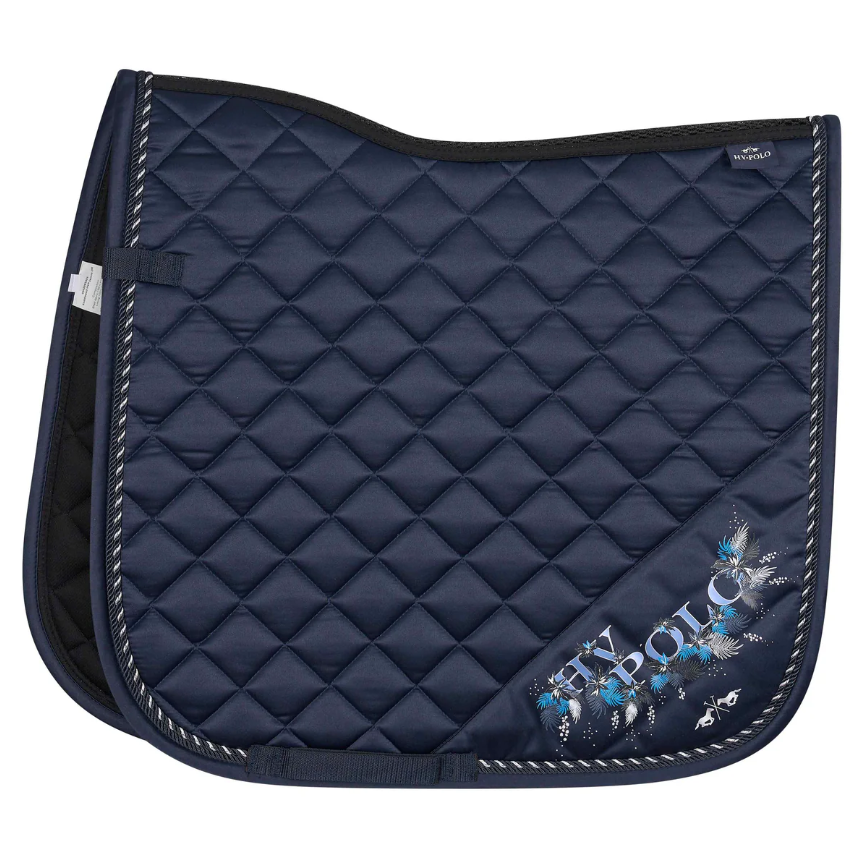 Shiny dressage saddle pad with satin look, faux fur at the withers, square shaped quilting and fancy rope along binding and printed artwork.