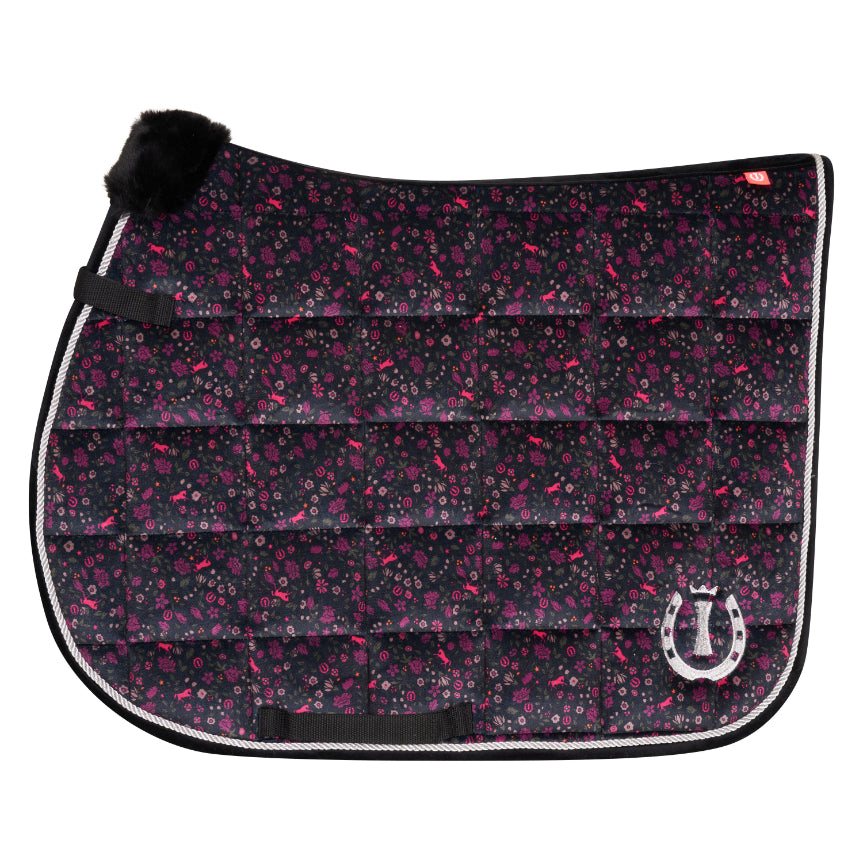 You and your horse will never stop blooming with this multi colored all-over flower print. This saddlepad is made from very luxury unique velvet AOP material. The wither is covered in colored extra soft fake fur and the saddlepad comes with a technical lining for regulation on sweat and heat. Have you find the hidden horses in the print already? Let’s play a game and count.