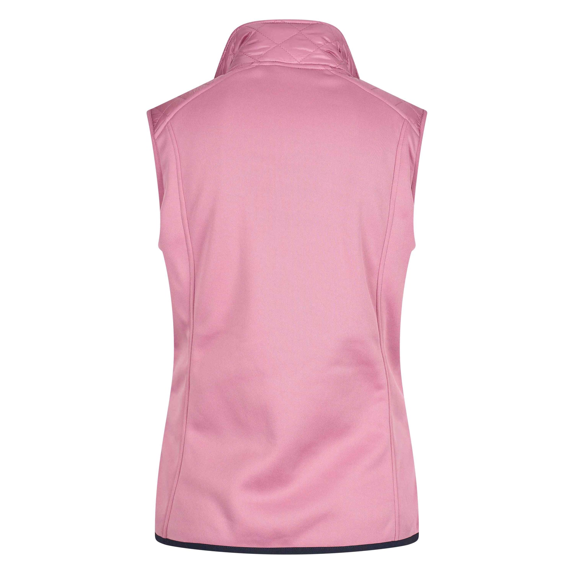 Outside of collar and shoulder parts covered with quilted polyester * Contrast binding at bottom hem and armholes * Fancy knitted tape side seams * 2 way zipper closure at front with contrast piping alongside zip * 2 insert pockets with zipper closure * Printed artwork alongside front zipper * Metal logo plate at front