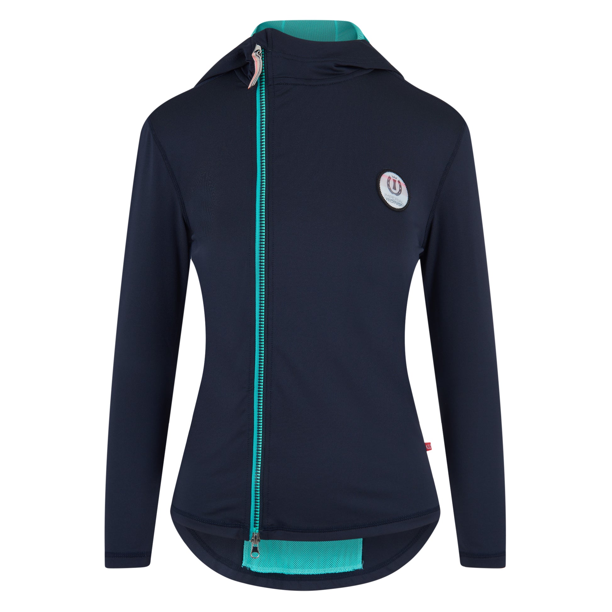 This sporty sweat jacket really is “super cool”. The first thing you notice is the lateral two-coloured 2-way zip in a contrasting colour, with its practical, easy-to-find puller. This can be helpful, for example, if you are wearing gloves. A sewn-in chin protector completes the zip at the top. The left chest features a sewn-on 3D Imperial Riding logo badge. The Super Cool sweat jacket features a large hood that has been lined with a special mesh insert to make it more breathable. On the back side, an internal pocket has been integrated. The puller of the covered-up zip is large enough in order for you to be able to use it during your sport. The outer sides of the sleeves feature the “Imperial Riding” lettering in large block letters. On the seam at the bottom on left-hand side, there is a small red logo flag. The jacket, cut to be a little longer at the back, features a narrow hem, narrow cuffs on the sleeves. Material: Functional, quick-drying, breathable 4-way stretch